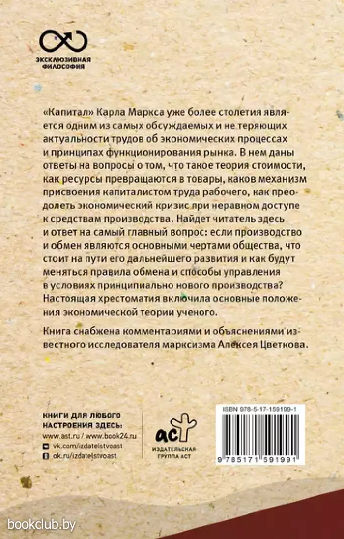 "Капитал" Карла Маркса уже более столетия является одним из самых обсуждаемых и не теряющих актуальности трудов об экономических процессах и принципах функционирования рынка. В нем даны ответы на вопросы о том, что такое теория стоимости, как ресурсы превращаются в товары, каков механизм присвоения капиталистом труда рабочего, как преодолеть экономический кризис при неравном доступе к средствам производства. Найдет читатель здесь и ответ на самый главный вопрос: если производство и обмен являются основными чертами общества, что стоит на пути его дальнейшего развития и как будут меняться правила обмена и способы управления в условиях принципиально нового производства? Настоящая хрестоматия включила все основные положения экономической теории ученого.