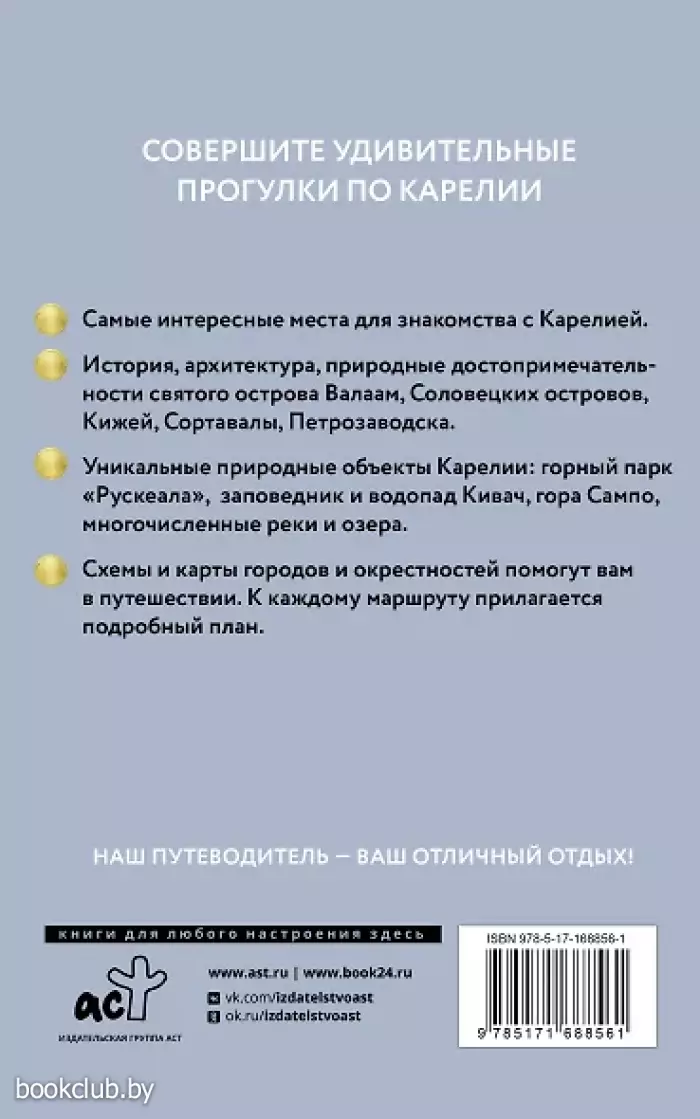 Путеводитель рассчитан на путешественников, готовых познакомиться с Карелией. В книге вы найдете описания маршрутов самых интересных прогулок по городам и заповедным, но доступным местам. Фотографии дадут представление о местности и достопримечательностях, а карты и схемы значительно облегчат ориентирование. С нашим путеводителем за меньшее количество времени вы увидите больше.