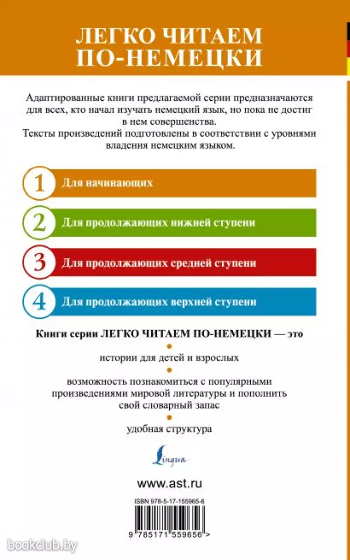 Книга от издательства «АСТ», входящая в серию «Легко читаем по-немецки», принесет массу положительных впечатлений от прочтения и займет достойное место в вашей библиотеке. Для вашего удобства при оформлении заказа по телефону назовите код товара: 198318