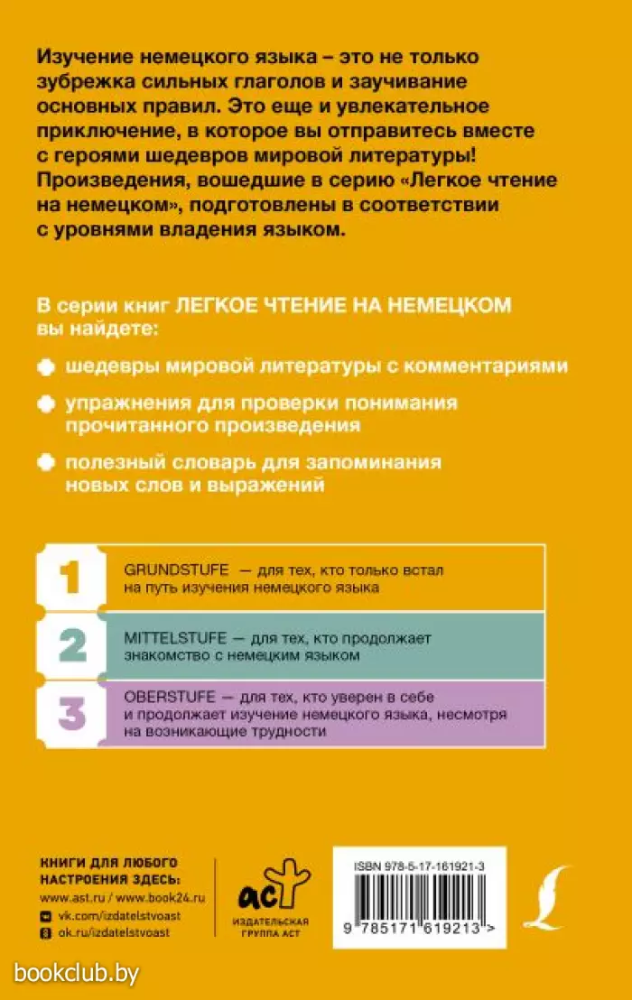 Книга от издательства «АСТ», входящая в серию «Легкое чтение на немецком», принесет массу положительных впечатлений от прочтения и займет достойное место в вашей библиотеке. Для вашего удобства при оформлении заказа по телефону назовите код товара: 198338