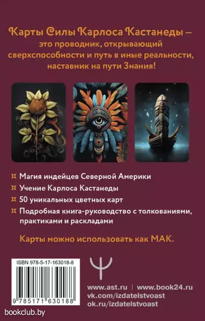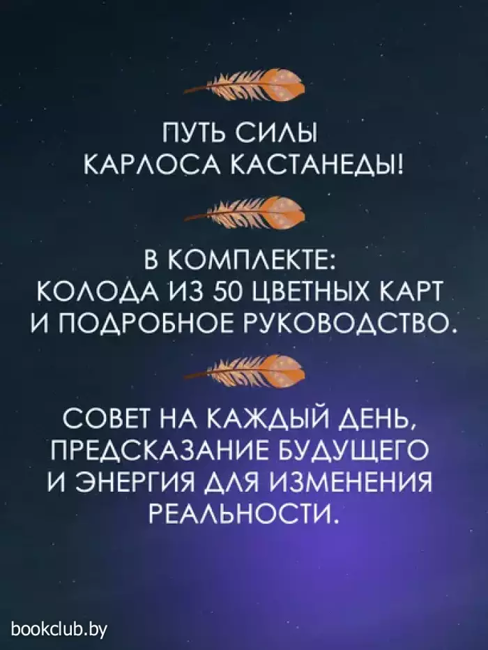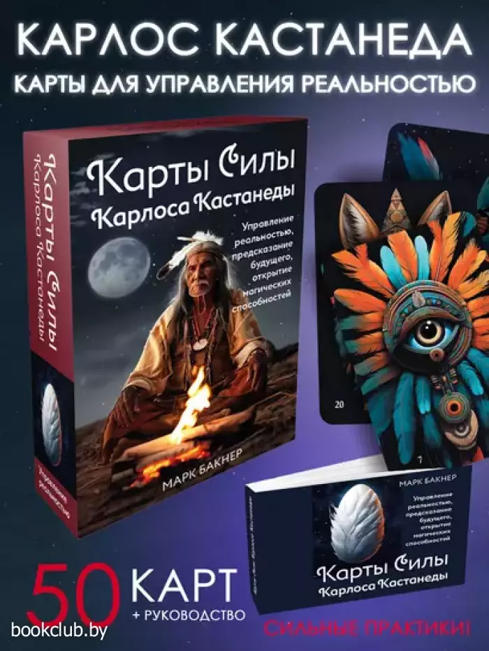 Карты, созданные М. Бакнером на основе метода Карлоса Кастанеды, — наставники в обретении Силы, проводники к вашим скрытым способностям. Пятьдесят магических образов на картах откроют путь знаний индейских шаманов-брухо, а книга-руководство с толкованиями, практиками и раскладами, основанными на учении Кастанеды, поможет заглянуть в будущее и прикоснуться к тайному Знанию, до недавних пор открытому только посвященным. На этом пути возможно все: самореализация, исполнение любых желаний и достижение самых невероятных целей. С помощью этой колоды карт можно: · получить энергию для исполнения любых желаний и достижения самых невероятных целей; · найти ответ на любой интересующий вопрос и увидеть выход из любой ситуации; · проникнуть в иную магическую реальность — мир нагваля и раскрыть свои сверхспособности; · получить прогноз на будущее; · проводить духовные практики. Можно использовать колоду в качестве МАК (метафорических ассоциативных карт) в работе психолога. Приступайте к работе с Картами и помните: тот, кто идет неустанно, в конце концов, достигнет цели! В комплекте — колода цветных карт (50 штук, размер 8×12 см) и брошюра с подробным руководством (256 страниц).