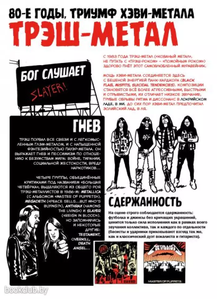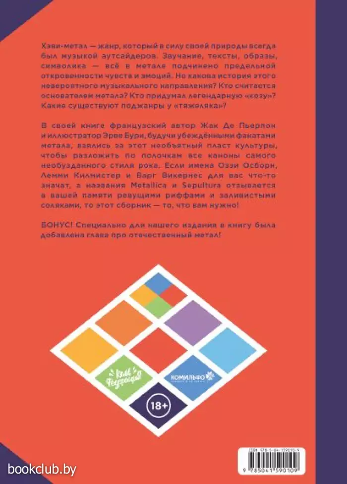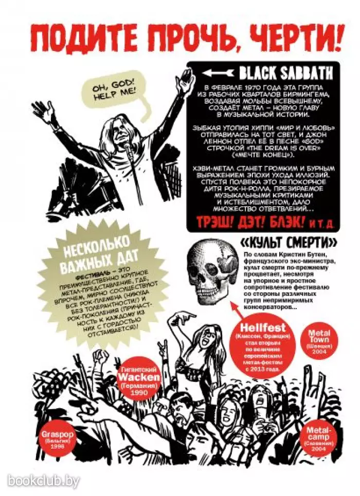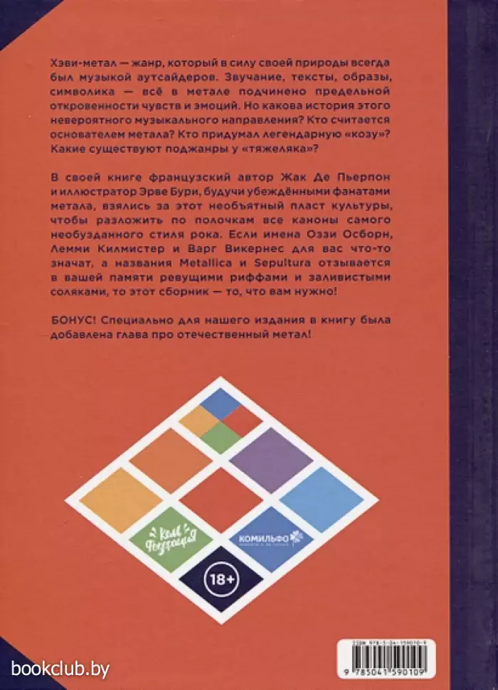 и иллюстратор Эрве Бури, будучи убеждёнными фанатами метала, взялись за этот необъятный пласт культуры, чтобы разложить по полочкам все каноны самого необузданного стиля рока. Если имена Оззи Осборн, Лемми Килмистер и Варг Викернес для вас что-то значат, а названия Metallica и Sepultura отзывается в вашей памяти ревущими риффами и заливистыми соляками, то этот сборник — то, что вам нужно!