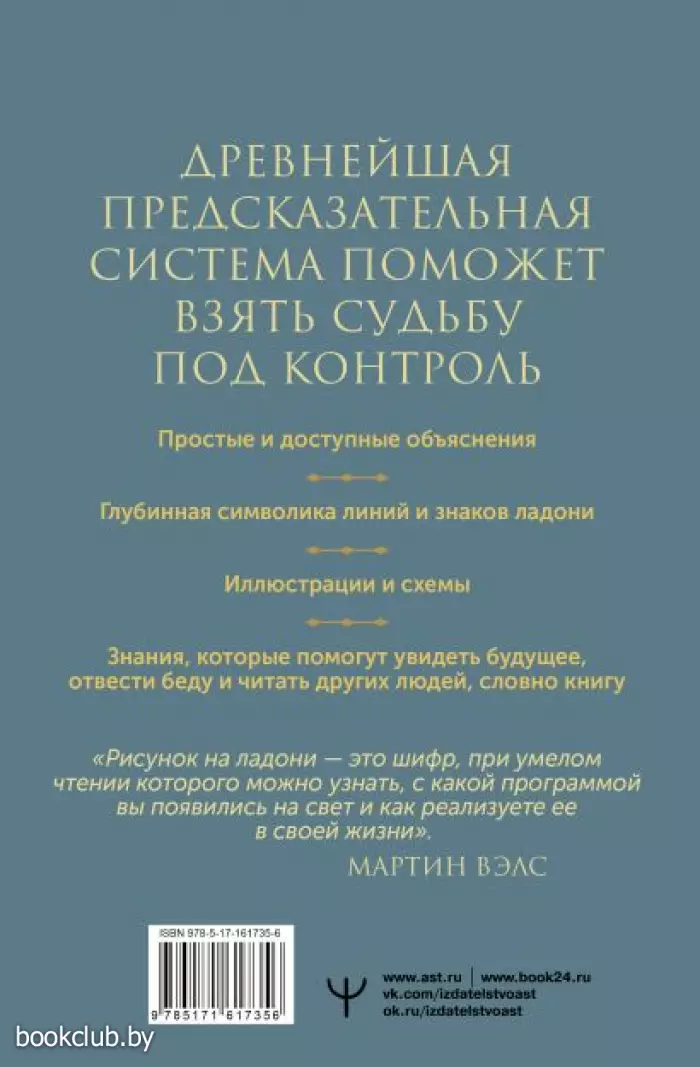 С книгой Мартина Вэлса, настоящего Мастера Хиромантии с опытом более 20 лет, вы научитесь "читать по руке" и видеть знаки судьбы. Здесь вы найдете ценную информацию, которая поможет вам не только больше узнать о себе и других людях, но и увидеть будущее, отвратить беду, наладить жизнь — свою, своих близких и всех тех, кому захотите помочь.