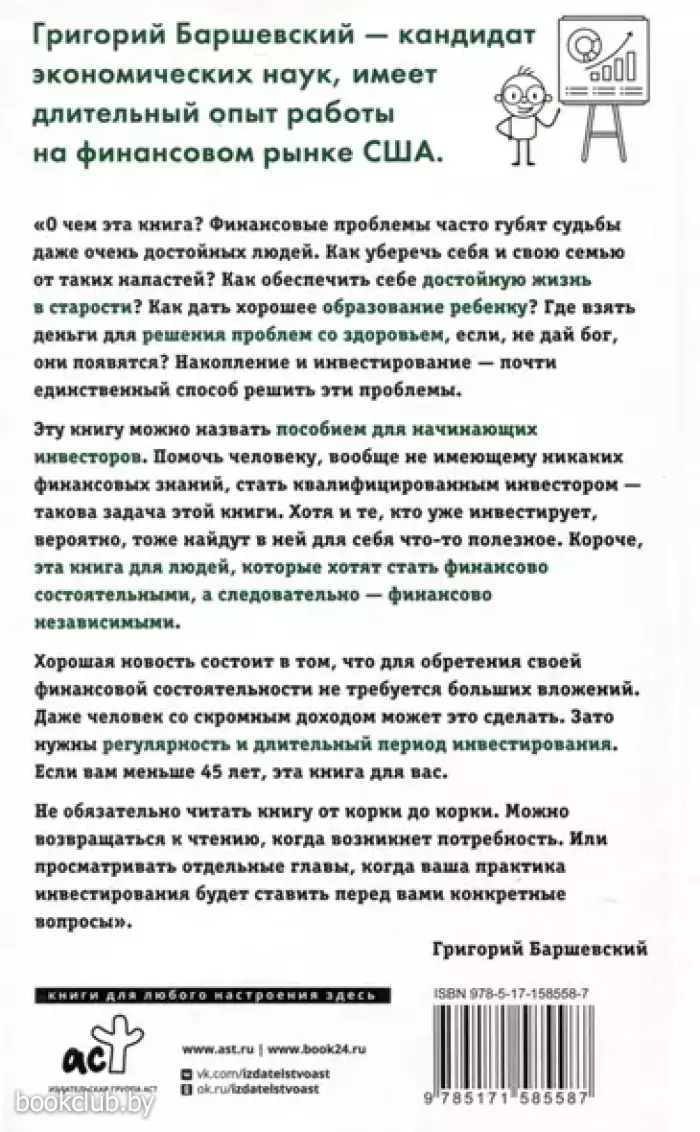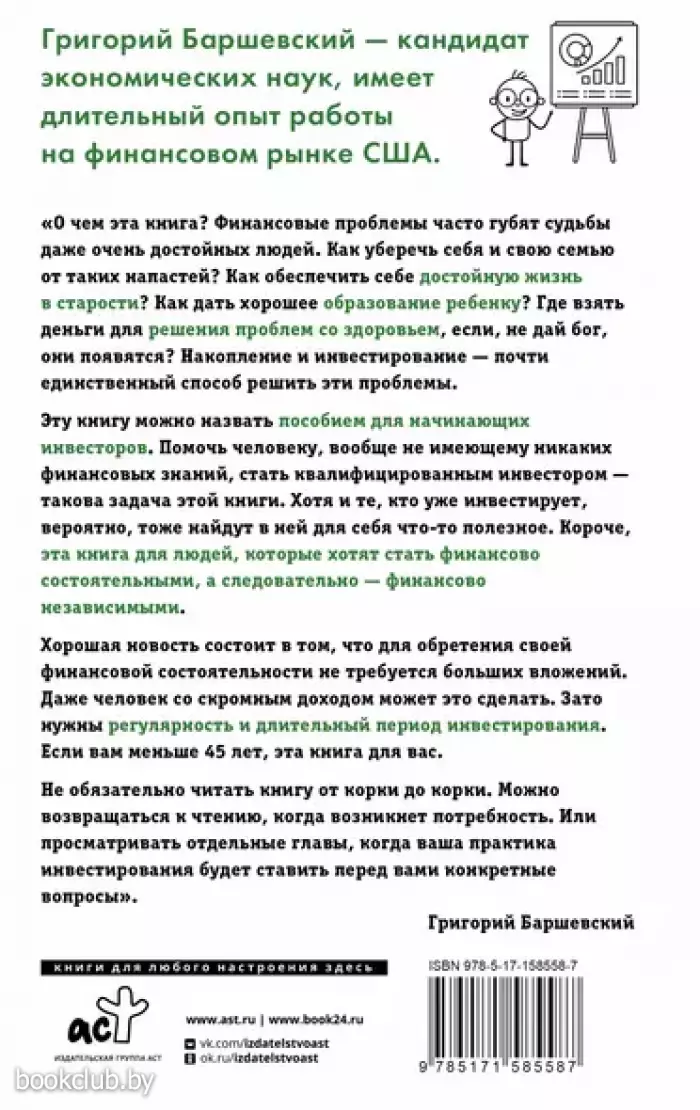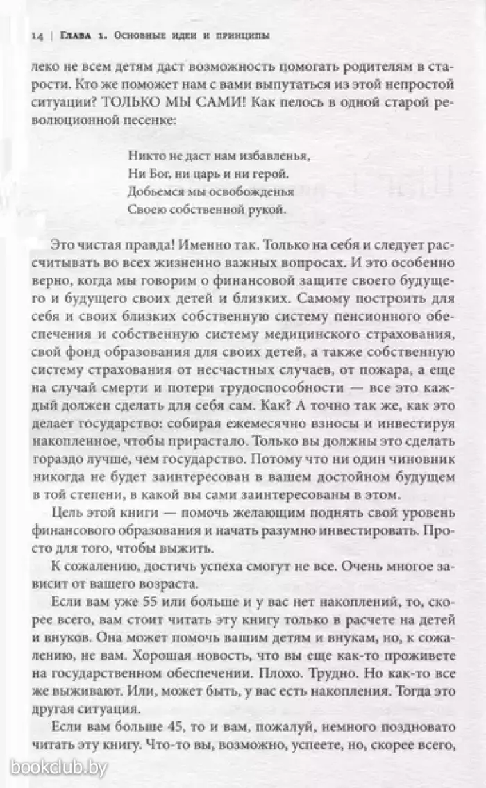Хорошая новость состоит в том, что для обретения своей финансовой состоятельности не требуется больших вложений. Даже человек со скромным доходом может это сделать. Зато нужна регулярность и длительный период инвестирования. Если вам меньше 45 лет, эта книга для вас.