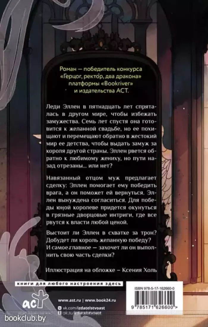 Леди Эллен в пятнадцать лет спряталась в другом мире, чтобы избежать замужества. Семь лет спустя она готовится к желанной свадьбе, но ее похищают и перемещают обратно в жестокий мир ее детства, чтобы выдать замуж за короля другой страны. Эллен рвется обратно к любимому жениху, но пути назад отрезаны… или нет? Навязанный отцом муж предлагает сделку: Эллен помогает ему победить врага, а он поможет ей вернуться. Эллен вынуждена согласиться. Для победы юной королеве придется окунуться в грязные дворцовые интриги, где все рвутся к власти любой ценой. Выстоит ли Эллен в схватке за трон? Добудет ли король желанную победу? И самое главное — захочет ли он выполнить свою часть сделки?
