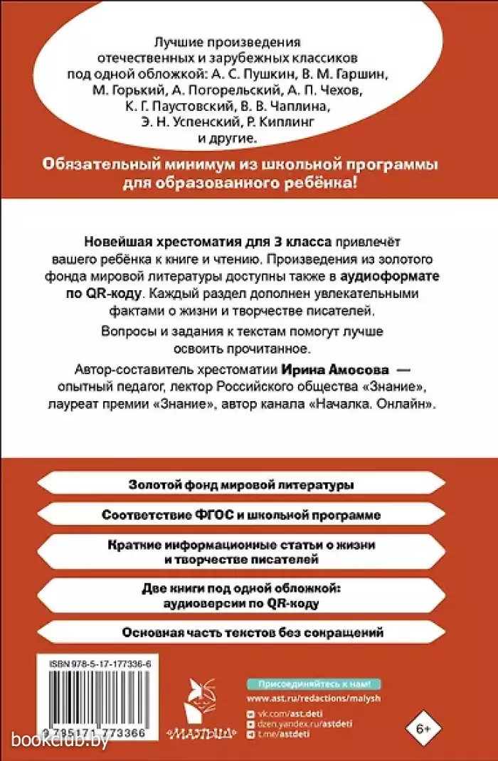 Как помочь ребенку легко освоить школьную программу? Какая хрестоматия поможет сделать чтение не только полезным, но и увлекательным занятием? Новейшая хрестоматия для 3 класса — это уникальный интерактивный формат, который совмещает две книги под одной обложкой. В хрестоматию вошли произведения из золотого фонда мировой литературы: А. С. Пушкин, А. Погорельский, М. Горький, К. Г. Паустовский, Р. Киплинг и других выдающихся писателей. Все произведения отобраны в соответствии с программой по литературе. Полные аудиоверсии произведений доступны по QR-коду. Составитель хрестоматии Ирина Амосова, учитель начальных классов, лауреат премии «Знание», автор образовательного канала дополнила каждый раздел краткими статьями о связи истории и литературы. Также по QR-кодам доступны дополнительные материалы, которые познакомят юного читателя с культурным наследием, помогут расширить кругозор и привить любовь к литературе. Книга поможет закрепить навыки работы с текстом, познакомиться с классическими произведениями русской и зарубежной литературы, улучшить технику чтения. Хрестоматия подходит для самостоятельного чтения и для подготовки к урокам по литературе. Книга станет отличным помощником для каждого школьника.