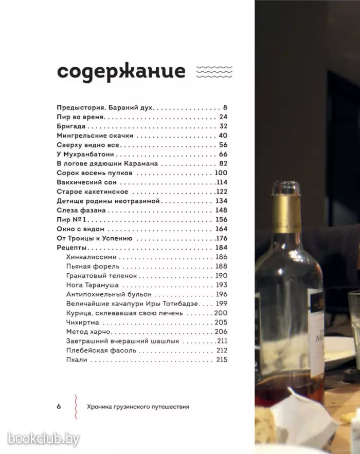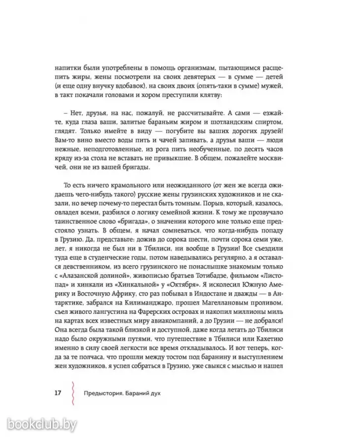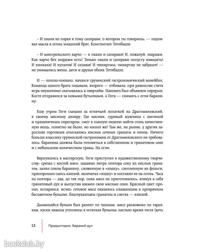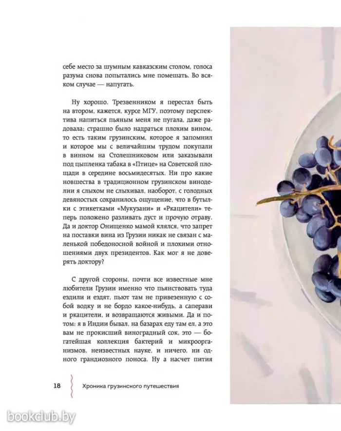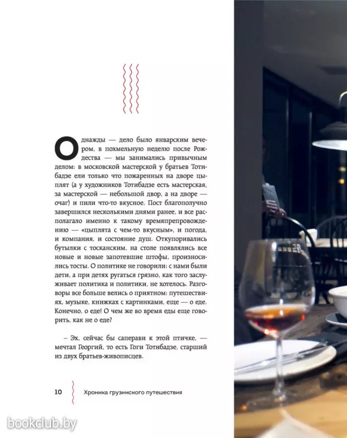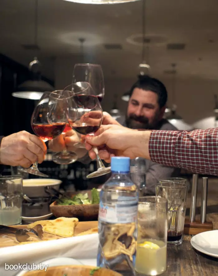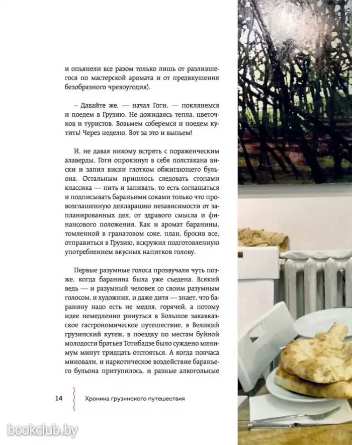 Герои книги отправляются в Большое закавказское гастрономическое путешествие, проезжают Грузию насквозь и в каждом населенном пункте умудряются съесть все самое замечательное. Попутно они вместе с друзьями погружаются в воспоминания о советском времени и «лихих 90-х», травят бесконечные байки и анекдоты о грузинских (и не только) знаменитостях и, конечно, описывают свои ощущения от прошлых и настоящих застолий. Причем так смачно, что в Грузию хочется бежать, чтобы попробовать эларджи, харчо, вареную козлятину и купаты в мингрельском ресторане на заброшенном тбилисском ипподроме. Или сациви, лобио, деревенских цыплят, «Горули мцване» «Тавквери», Шавкапито» и «Саперави» из княжеских подвалов шато «Мухрани». Или цоцхали, гигантские котлеты и коньячный спирт в логове дядюшки Карамана. Или хачапури и каурму в ресторане в Казбеги. Или хинкали всех мастей в придорожных харчевнях. От описаний неизменно текут слюнки. Кстати, рецепты всего самого вкусного и удивительного (включая антипохмельный суп с яйцом) прилагаются. И написаны они так, что удержаться и не приготовить почти невозможно. Да и вся книга радует отличным литературным слогом и безупречным стилем. Чувствуется влияние Довлатова, Битова и Венички Ерофеева. Автор потрясающий рассказчик и с легкостью увлекает нас за собой.
