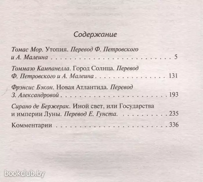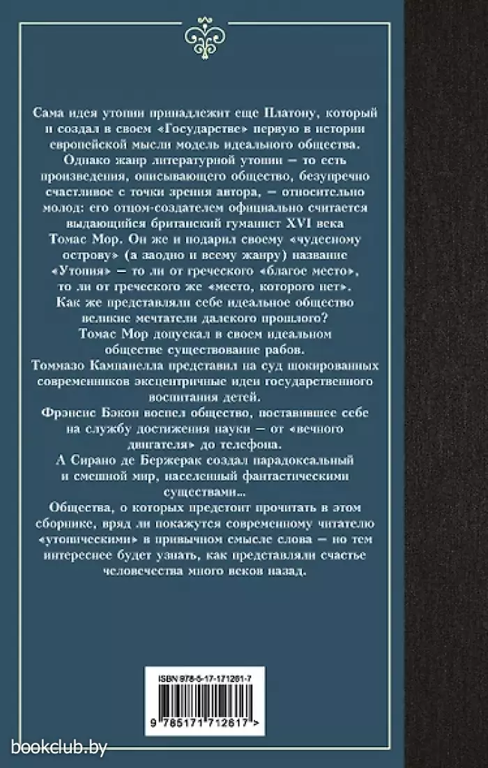 Сама идея утопии принадлежит еще Платону, который и создал в своем «Государстве» первую в истории европейской мысли модель идеального общества. Однако жанр литературной утопии – то есть произведения, описывающего общество, безупречно счастливое с точки зрения автора, – относительно молод: его отцом-создателем официально считается выдающийся британский гуманист XVI века Томас Мор. Он же и подарил своему «чудесному острову» (а заодно и всему жанру) название «Утопия» – то ли от греческого «благое место», то ли от греческого же «место, которого нет». Как же представляли себе идеальное общество великие мечтатели далекого прошлого? Томас Мор допускал в своем идеальном обществе существование рабов. Томмазо Кампанелла представил на суд шокированных современников эксцентричные идеи государственного воспитания детей. Фрэнсис Бэкон воспел общество, поставившее себе на службу достижения науки – от «вечного двигателя» до телефона. А Сирано де Бержерак создал парадоксальный и смешной мир, населенный фантастическими существами… Общества, о которых предстоит прочитать в этом сборнике, вряд ли покажутся современному читателю «утопическими» в привычном смысле слова – но тем интереснее будет узнать, как представляли счастье человечества много веков назад.