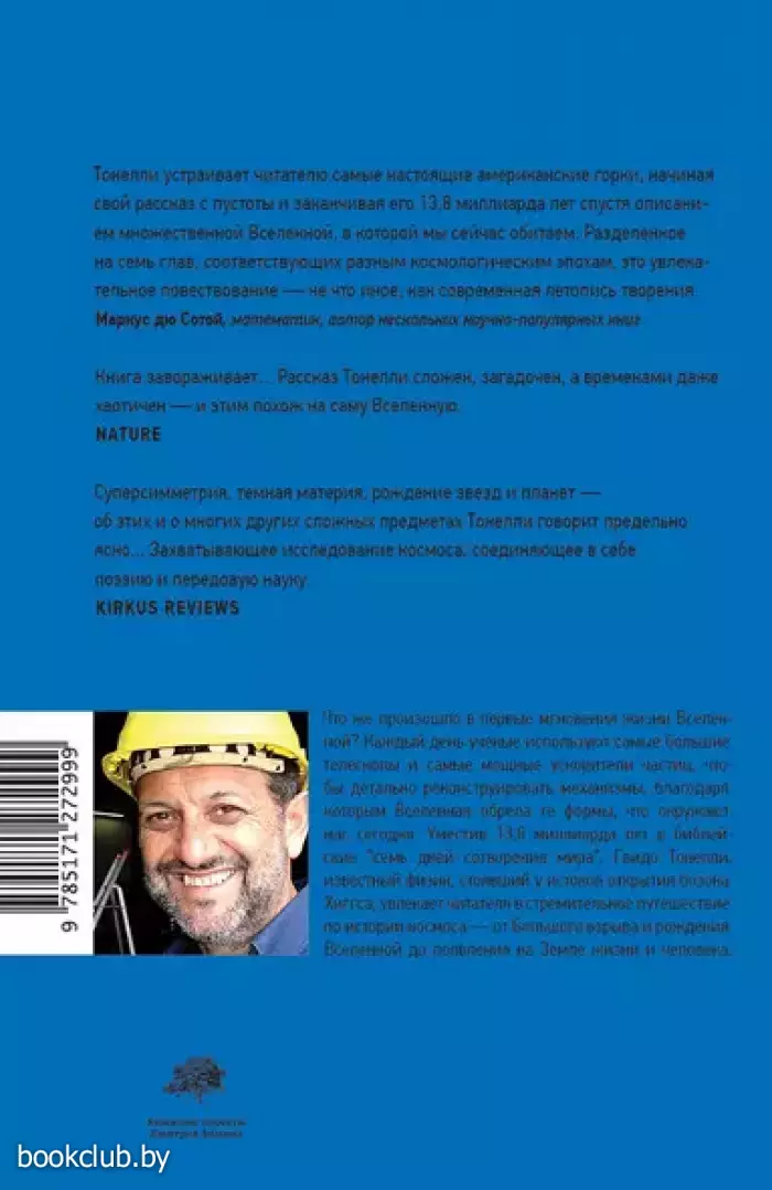 “Книга Бытия” всемирно известного физика Гвидо Тонелли хоть и поделена на семь частей в соответствии с семью днями сотворения мира, но охватывает намного более значительный временной отрезок, а именно 13,8 миллиарда лет. Тонелли задается целью описать жизнь Вселенной от ее первых мгновений до наших дней. Большой взрыв, космическая инфляция, бозон Хиггса, материя, антиматерия, первые протоны, а затем фотоны, кварки и лептоны, первые ядра и атомы, ядерные процессы, первая звезда, галактики и сила гравитации… Все это сочетается у автора с историей науки, литературой, кино, рекламой и даже мифологическими сюжетами. Так, говоря о концепции пустоты, он противопоставляет греческую школу мысли, которая отрицала возможность небытия, и Индуистскую мифологию, где Шива раз за разом разрушает вселенную до абсолютного нуля, а затем снова воздвигает ее из ничего.