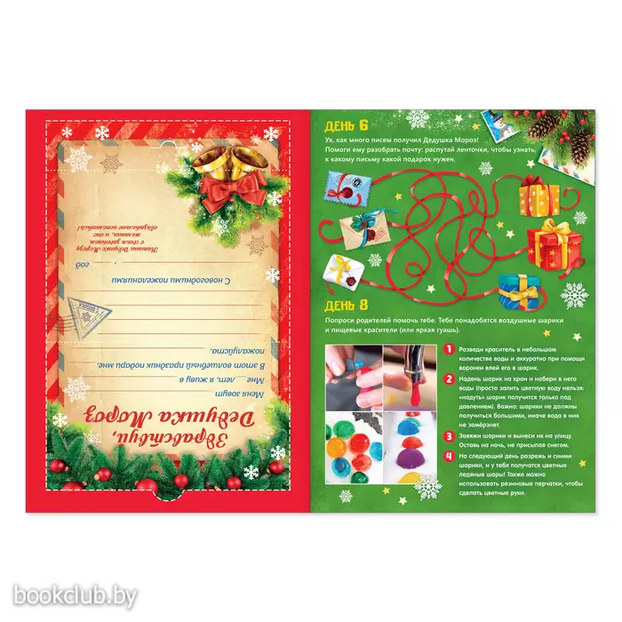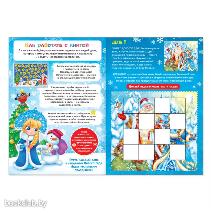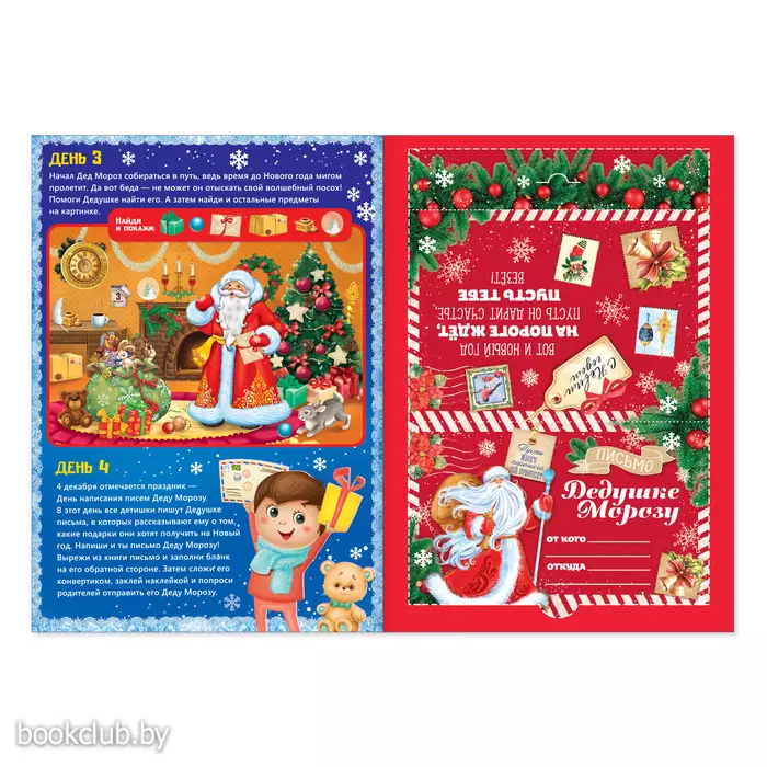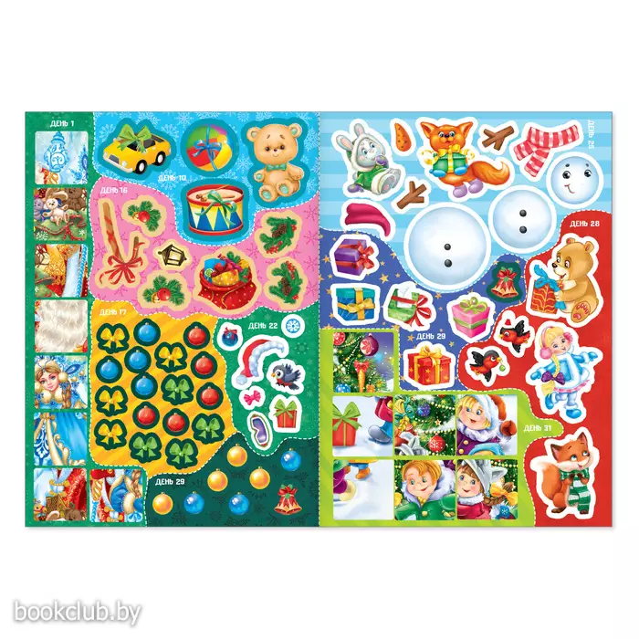 В течение всего декабря малыш будет выполнять задания и отмечать даты в календаре с помощью наклеек. Ребёнок напишет письмо Деду Морозу, раскрасит картинки, расшифрует слова, преодолеет лабиринты.