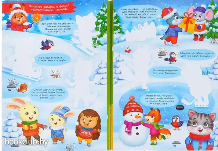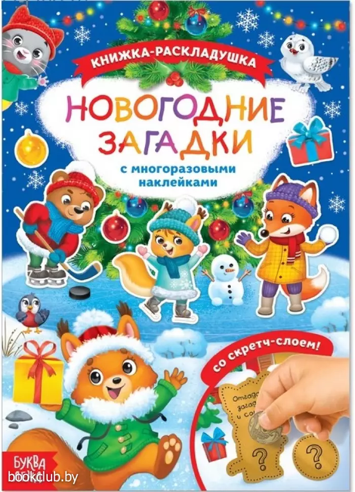 «Новогодние загадки» — это книжка-раскладушка с интересными заданиями и яркими многоразовыми наклейками.В процессе игры ребёнок ответит на загадки с помощью наклеек, сотрёт скретч-слой, чтобы узнать ответы на самые интересные вопросы. А ещё малыш будет раздавать подарки зверям вместе с Дедом Морозом, украшать ёлку и угадывать, где спрятались животные.