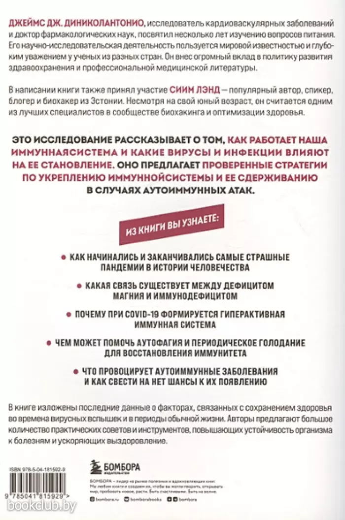 Для крепкого здоровья нет ничего важнее, чем иммунная система. Это защитный барьер, который оберегает от внешних угроз и всевозможных болезнетворных микроорганизмов, окружающих нас каждый день. Когда иммунная система ослаблена, снижается уровень энергии, ухудшается качество жизни и пополняется бесконечный список заболеваний, а разве такое может вдохновлять? Эта книга рассказывает, какие практики поддержки иммунитета действительно работают, а какие — лишь ловкий маркетинговый ход.