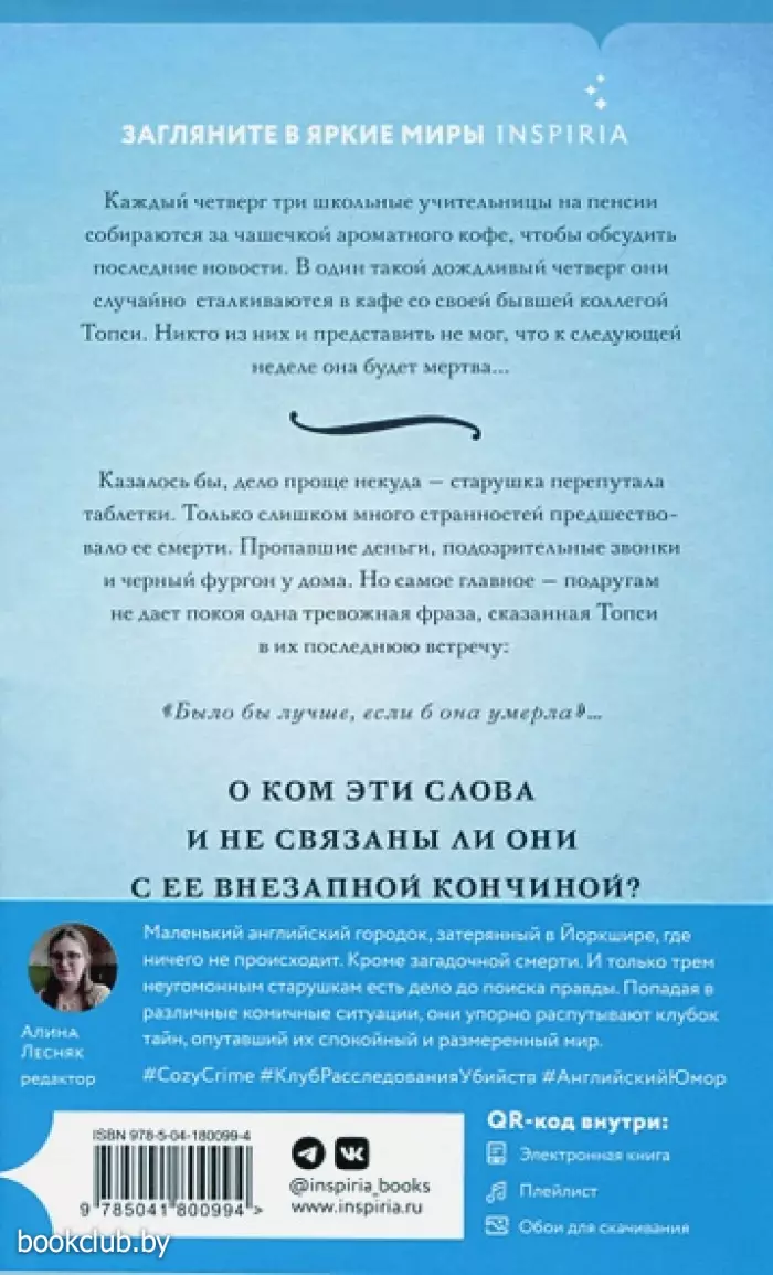 Насладитесь за чашкой кофе этим остроумным и заразительным детективом в духе Агаты Кристи и Ричарда Османа. Три самых неожиданных сыщицы, которых вы когда-либо встречали.