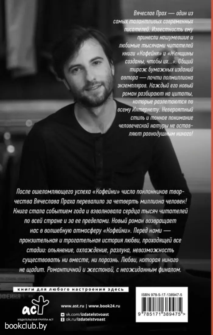 Вячеслав Прах, буквально взорвавший Сеть своим романом «Кофейня», выпустил долгожданное продолжение нашумевшей истории. Здесь с необычайной выразительной силой показаны все цвета, которые составляют палитру любви, от восторга до отчаяния. Главный герой теряет сперва дочь, а затем возлюбленную. Теперь ему остается лишь вновь и вновь прокручивать, словно старую кинопленку, свои воспоминания, пытаясь найти ответ, кто же тот загадочный убийца, который сломал его жизнь. Но за детективной канвой с неожиданным и трагическим финалом скрывается на самом деле удивительная, трогательная и лиричная история любви. Прах создает воздушный, наполненный призраками и миражами мир двух возлюбленных, мир, где любовь находится на самом кончике пальцев, а прикосновения могут таить в себе как великое блаженство, так и неминуемую гибель. Это роман для тех, кто хочет разобраться в природе чувств, понять, что же такое привязанность, ненависть, ревность, разочарование и надежда. И, пожалуй, лучшим описанием книги, является цитата из нее: “Как жаль, что некоторым птицам суждено разбиться о небо, так и не добравшись до теплых краев”.