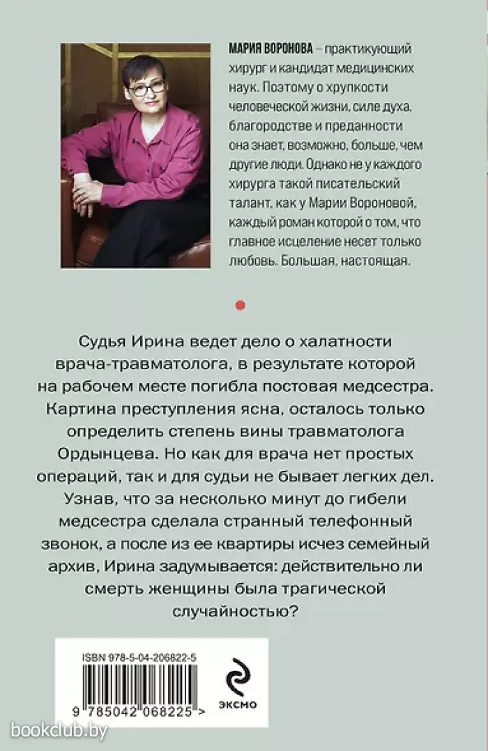 Мария Воронова давно известна среди читателей как автор женского романа и постепенно набирает популярность. Она практикующий хирург, ежедневно сталкивающийся с десятками человеческих судеб. Ее работа дает огромное количество жизненных сюжетов, которые получают воплощение на бумаге. Ее романы мудры, герои живые, а многие фразы становятся афоризмами.