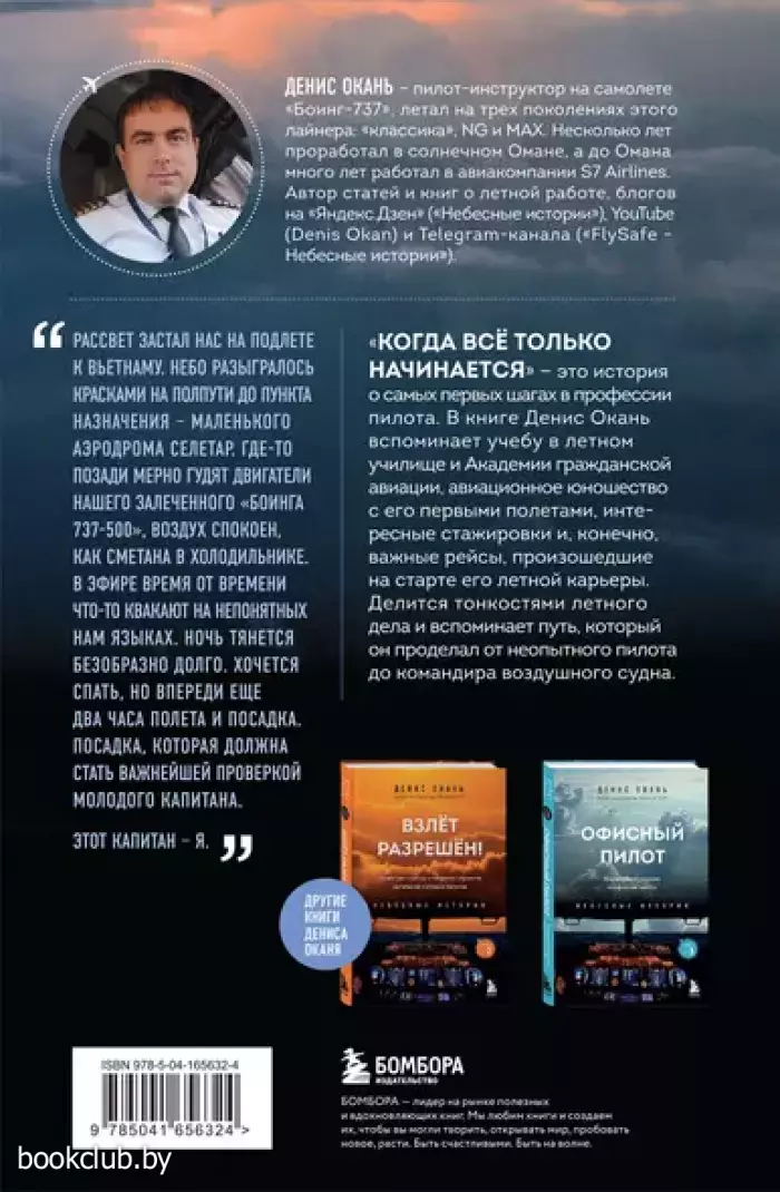 ДЕНИС ОКАНЬ, пилот-инструктор гражданской авиации, написал книгу о главном деле своей жизни. «Когда всё только начинается» — это история о самых первых шагах в профессии пилота. В книге Денис вспоминает учебу в Бугурусланском летном училище, Академии гражданской авиации г. Санкт-Петербурга и учебном центре United Airlines в США, свои первые шаги в освоении самолетов Ан-2, Ту-154, Боинга 737 и, конечно, памятные рейсы, случившиеся в начале его летной карьеры. Делится тонкостями летного дела и вспоминает путь, который он проделал от неопытного пилота до командира воздушного судна. Вы узнаете, чему учатся пилоты и как готовятся к выполнению поставленных задач, как выполняются полеты по реальным маршрутам в различных погодных условиях, как справляются с нестандартными ситуациями, и многое другое о буднях гражданской авиации.