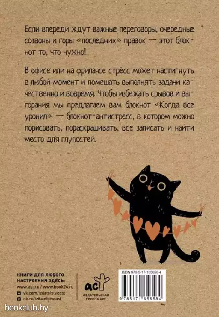 Если впереди ждут важные переговоры, очередные созвоны и горы «последних» правок — этот блокнот то, что нужно! В офисе или на фриласе стресс может настигнуть в любой момент и помешать выполнять задачи качественно и вовремя. Чтобы избежать срывов и выгорания, мы предлагаем вам блокнот «Когда все уронил» — блокнот-антистресс, в котором можно порисовать, пораскрашивать, все записать и найти место для глупостей. Ежедневник недатированный.