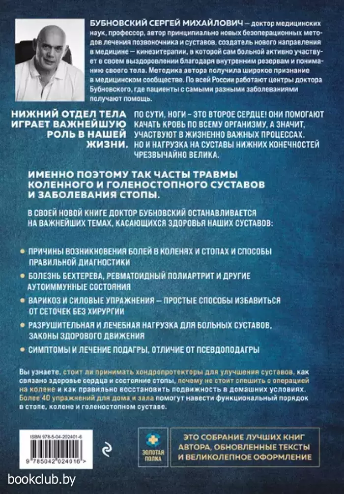 Новая книга доктора Бубновского посвящена здоровью колена и стопы. Вы узнаете, стоит ли принимать хондропротекторы для восстановления суставов, как связано здоровье сердца и состояние стопы, почему не стоит спешить с операцией на колене и как правильно вернуть подвижность в домашних условиях. Более 40 упражнений для дома и зала помогут навести функциональный порядок в стопе, колене и голеностопном суставе.