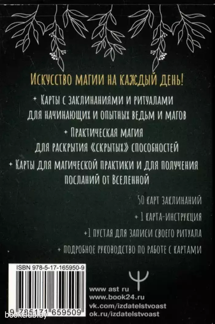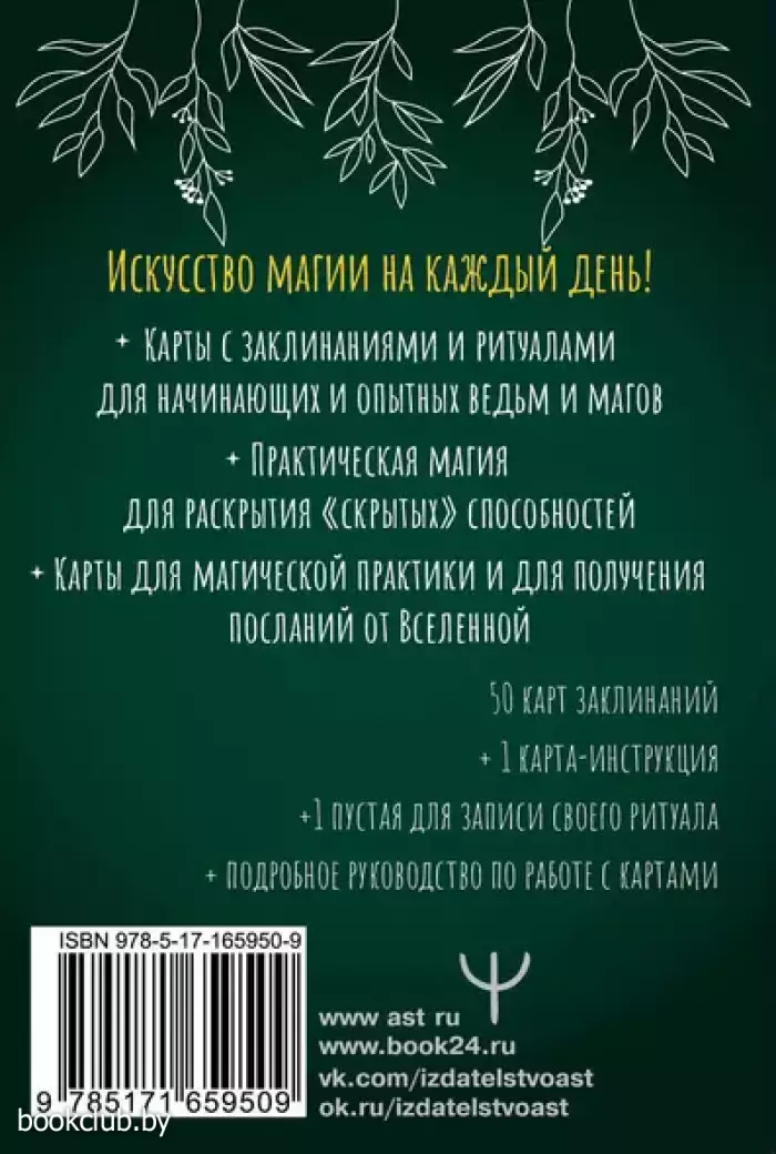 Некоторые люди полагают, что магия — это недоступное знание, в существовании которого можно сомневаться. На самом деле она — инструмент, который работает с реальностью. Колода в ваших руках — доказательство, что магия существует. Теперь вам не нужно кропотливо изучать сложные книги заклинаний, чтобы найти подходящий к ситуации ритуал. Все самое необходимое находится на картах — быстро, подробно и удобно. Залог развития магических способностей — ежедневная практика. На каждой карте вы найдете ритуал, медитацию, рецепт приготовления эликсира или заклинания, для которых не потребуется особых усилий. Всё можно сделать, используя подручные средства и ингредиенты. В наборе 52 карты: 50 карт с заклинаниями, карта с инструкцией, пустая карта для создания собственного ритуала, плюс подробное руководство, которое поможет вам познакомиться с магией более детально. Магическая колода с заклинаниями — это незаменимый помощник, который подойдет как начинающим ведьмам, так и опытным колдуньям.