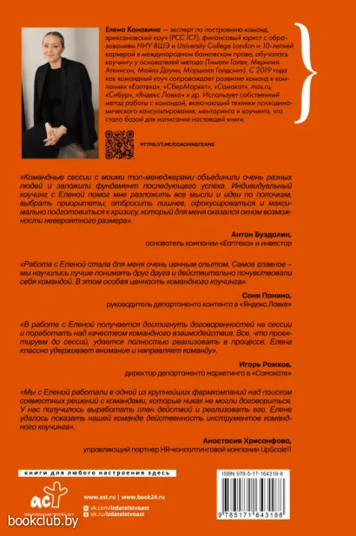 Елена Канавина – эксперт по построению команд, эриксоновский коуч (PCC ICF), финансовый юрист с образованием НИУ ВШЭ и University College London и 10-летней карьерой в международном банковском праве, обучалась коучингу у основателей метода (Тимоти Голви, Мерилин Аткинсон, Майлз Дауни, Маршалл Голдсмит). С 2019 года как командный коуч сопровождает развитие команд в компаниях "Еаптека", "СберМаркет", "Самокат", mos.ru, "Сибур", "Яндекс.Лавка" и др. Использует собственный метод работы с командой, включающий техники психодинамического консультирования, менторинга и коучинга, что стало базой для написания настоящей книги.