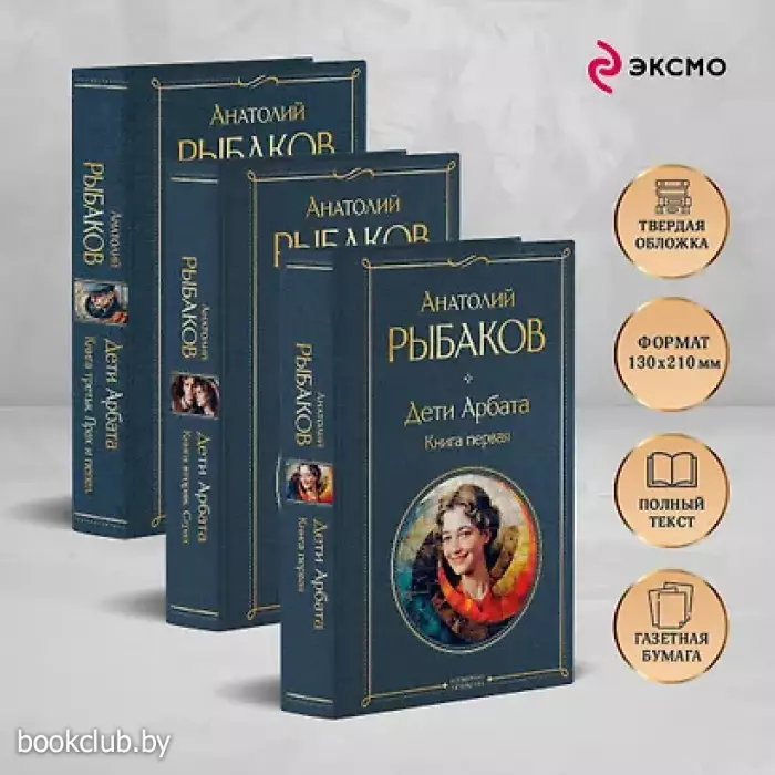 Вся трилогия Анатолия Рыбакова! «Дети Арбата». Книга первая. Поколение 1930-х годов. Какое оно и как его понять? Что его волнует и чем оно живет? Роман Анатолия Рыбакова «Дети Арбата» — это книга-путеводитель, которая показывает все грани московской жизни. Совершенно разные картины смешиваются между собой — то читатель встречает на страницах молодежь, живущую в коммунальных квартирах, то людей у власти, то руководителей научных учреждений среди институтских аудиторий. Эта книга о непростых судьбах поколения, живущего во времена правления Сталина. Отпечаток времени остался всюду — в духовном мире людей, в их характерах и семьях. «Дети Арбата». Книга вторая: «Страх» «Страх» — вторая часть трилогии Анатолия Рыбакова «Дети Арбата», действие которой происходит после убийства Кирова. Перед читателем разворачивается пугающая и беспощадная картина времен «зачистки» от врагов народа. Автор чутко и внимательно воссоздает в романе обстановку массового и кровавого террора, происходившего в середине 30-х годов. Герои сталкиваются с отчаянием и крайней безысходностью, они вовсе не знают, что ждет их завтра… Люди, судьбы, история — всё окутано страхом. Именно в такие трудные времена надо заново учиться жить. «Дети Арбата». Книга третья: «Прах и пепел» В заключительной части трилогии «Дети Арбата» Анатолия Рыбакова читатель вновь встречается со знакомыми героями. Они еще молоды, но на их судьбу выпало немало испытаний. Миллионы жизней пущены под откос. Поколение 30-х застало исторические события, в которых стирается понятие «человека», но свою индивидуальность герои не теряют. Они живут, влюбляются и сражаются за свое счастье вопреки всему. Всё уйдет пеплом по ветру, но лишь настоящие чувства, искренние люди и правдивые судьбы никогда не забудутся. Книги издательства «ЭКСМО» из серии «Всемирная литература. Новое оформление. Комплекты» - отличное приобретение для вас и ваших близких. Для вашего удобства при оформлении заказа по телефону назовите код товара: 417119