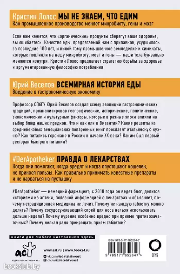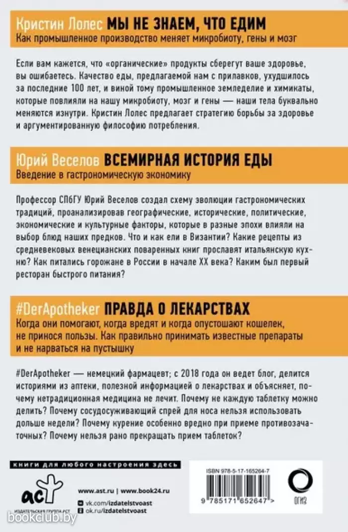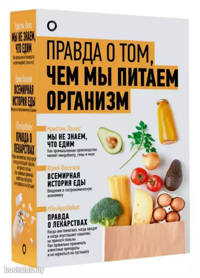 В составе этого сборника книги, которые рассказывают о истории того, чем мы питаем организм - от еды до лекарств. 'Всемирная история еды. Введение в гастрономическую экономику' описывает схему эволюции гастрономических традиций; 'Мы не знаем, что едим. Как промышленное производство меняет микробиоту, гены и мозг' поменяет ваш взгляд на 'органические продукты', а в книге 'Правда о лекарствах. Когда они помогают, когда вредят и когда опустошают кошелек не принося пользы. Как правильно принимать известные препараты и не нарваться на пустышку' делится историями из своего аптечного опыта и досконально объясняет, как с умом принимать лекартсвенные препараты.