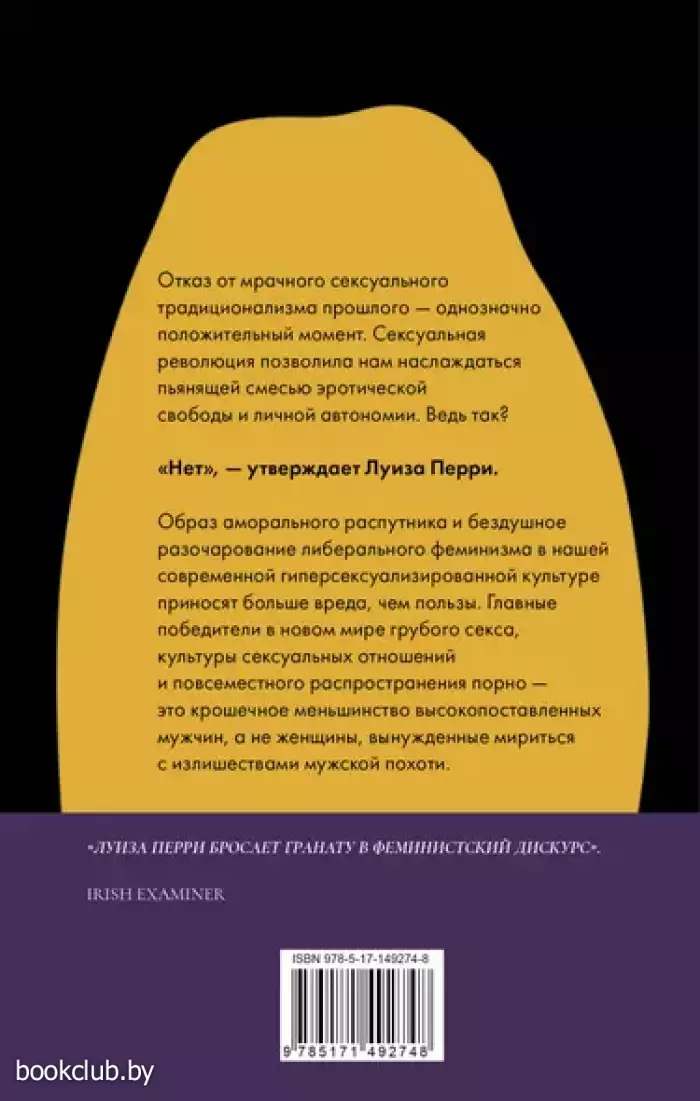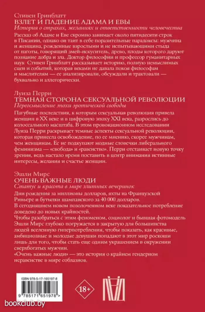 В этом провокционном исследовании Луиза Перри раскрывает темные аспекты сексуальной революции, которая принесла освобождение, по ее мнению, скорее мужчинам, чем женщинам. Ее не подкупают модные словечки либерального феминизма — "свобода" и "равенство". Перри отстаивает новую точку зрения, ведь настало время поставить в центр внимания истинные интересы, желания и счастье женщин.