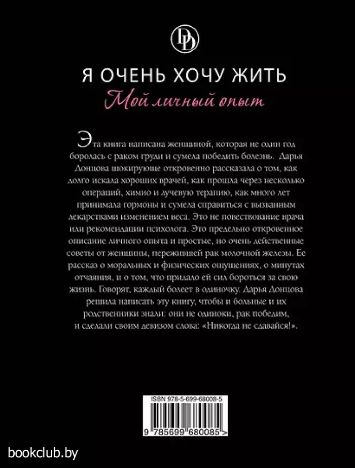 Эта книга написана женщиной, которая не один год боролась с раком груди и сумела победить болезнь. Дарья Донцова шокирующе откровенно рассказала о том, как долго искала хороших врачей, как прошла через несколько операций, химио- и лучевую терапию, как много лет принимала гормоны и сумела справиться с вызванным лекарствами изменением веса. Это не повествование врача или рекомендации психолога. Это предельно откровенное описание личного опыта и простые, но очень действенные советы от женщины, пережившей рак молочной железы. Ее рассказ о моральных и физических ощущениях, о минутах отчаяния и о том, что придало ей сил бороться за свою жизнь. Говорят, каждый болеет в одиночку. Дарья Донцова решила написать эту книгу, чтобы и больные и их родственники знали: они не одиноки, рак победим, и сделали своим девизом слова: «Никогда не сдавайся!».