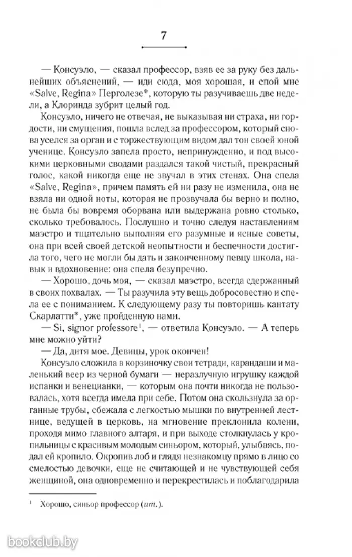 Прототипом героини этого романа послужила знаменитая французская певица, муза русского писателя Ивана Тургенева Полина Виардо Это увлекательная история девочки-сироты Консуэло, которой приходится преодолевать нелегкие испытания, даря людям свое искусство. Это книга о судьбе истинного художника, о тяжелом бремени таланта, дарованного судьбой, о сложном, а порой даже трагическом выборе между славой и личным счастьем.