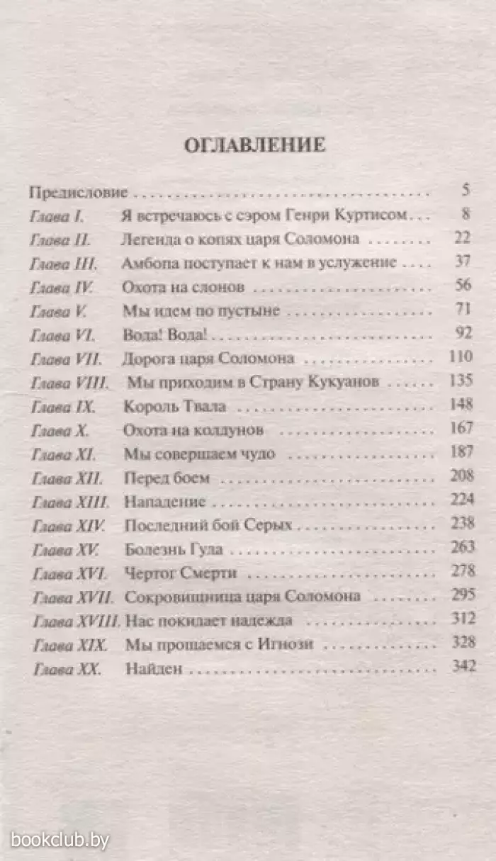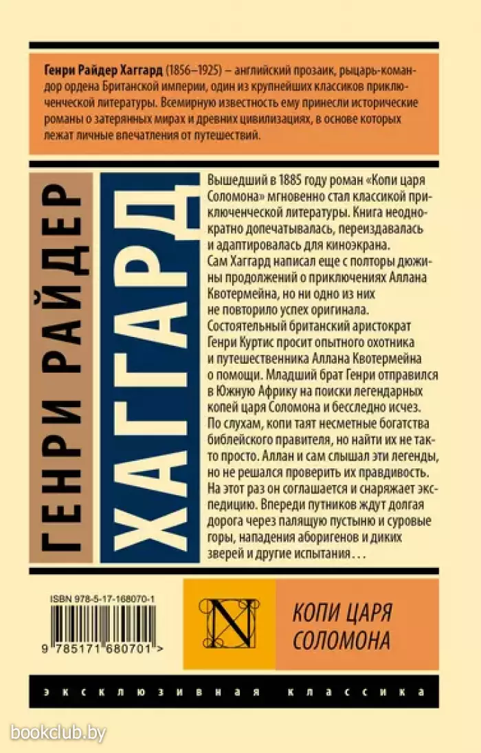 Вышедший в 1885 году роман «Копи царя Соломона» мгновенно стал классикой приключенческой литературы. Книга неоднократно допечатывалась, переиздавалась и адаптировалась для киноэкрана. Сам Хаггард написал еще с полторы дюжины продолжений о приключениях Аллана Квотермейна, но ни одно из них не повторило успех оригинала. Состоятельный британский аристократ Генри Куртис просит опытного охотника и путешественника Аллана Квотермейна о помощи. Младший брат Генри отправился в Южную Африку на поиски легендарных копей царя Соломона и бесследно исчез. По слухам, копи таят несметные богатства библейского правителя, но найти их не так-то просто. Аллан и сам слышал эти легенды, но не решался проверить их правдивость. На этот раз он соглашается и снаряжает экспедицию. Впереди путников ждут долгая дорога через палящую пустыню и суровые горы, нападения аборигенов и диких зверей и другие испытания…
