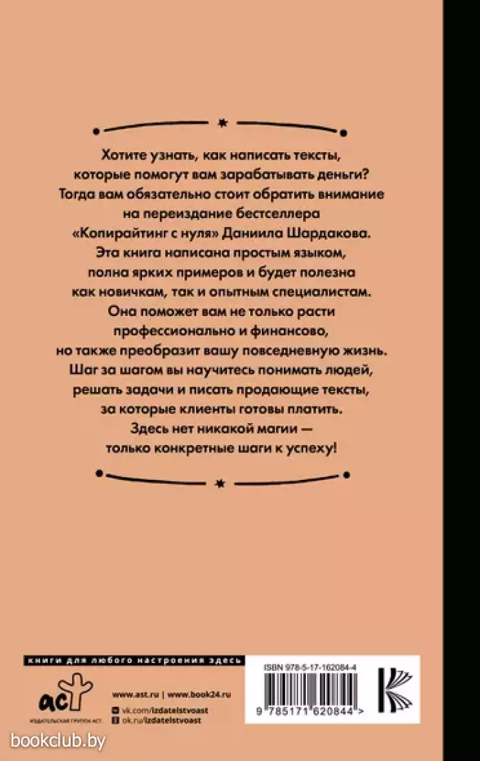 Хотите узнать, как написать тексты, которые помогут вам зарабатывать деньги? Тогда вам обязательно стоит обратить внимание на переиздание бестселлера «Копирайтинг с нуля» Даниила Шардакова. Эта книга написана простым языком, полна ярких примеров и будет полезна как новичкам, так и опытным специалистам. Она поможет вам не только расти профессионально и финансово, но также преобразит вашу повседневную жизнь. Шаг за шагом вы научитесь понимать людей, решать задачи и писать продающие тексты, за которые клиенты готовы платить. Здесь нет никакой магии — только конкретные шаги к успеху!