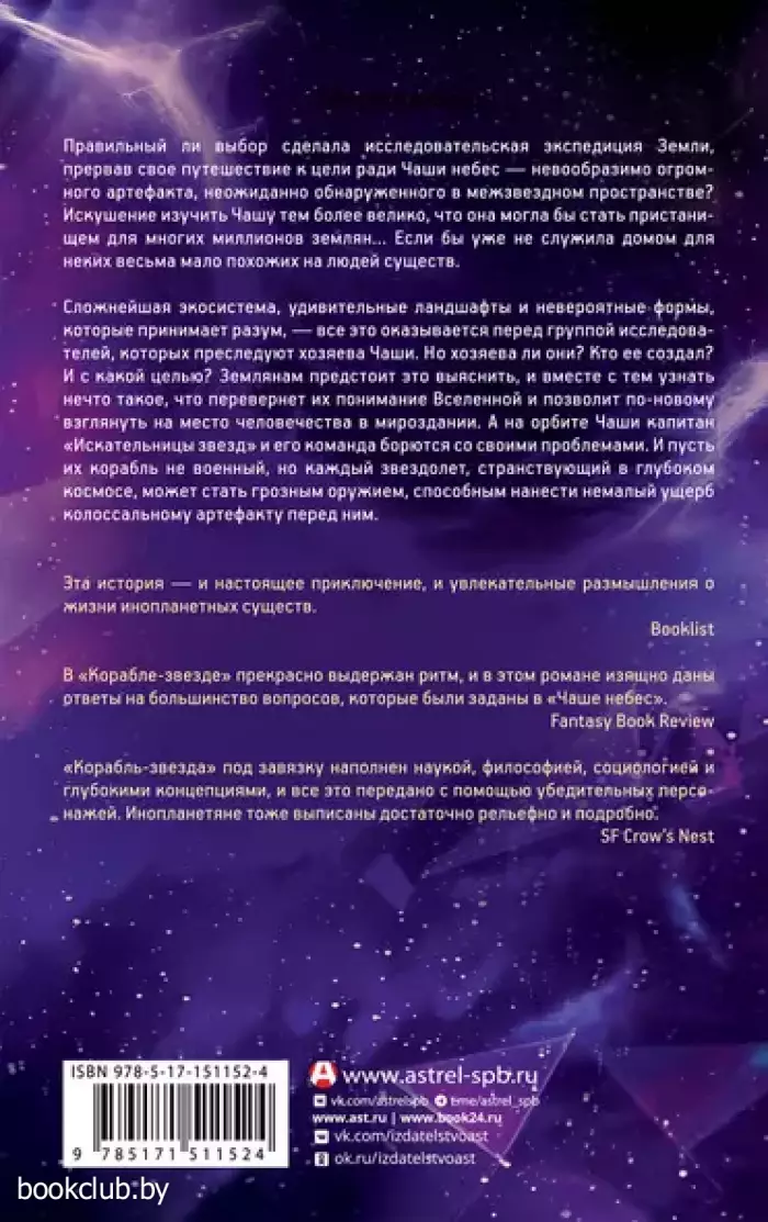 Правильный ли выбор сделала исследовательская экспедиция Земли, прервав свое путешествие к цели ради Чаши небес — невообразимо огромного артефакта, неожиданно обнаруженного в межзвёздном пространстве? Искушение изучить Чашу тем более велико, что она могла бы стать пристанищем для многих миллионов землян… Если бы уже не служила домом для неких весьма мало похожих на людей существ. Сложнейшая экосистема, удивительные ландшафты и невероятные формы, которые принимает разум — все это оказывается перед группой исследователей, которых преследует хозяева Чаши. Но хозяева ли они? Кто ее создал? И с какой целью? Землянам предстоит это выяснить, и вместе с тем узнать нечто такое, что перевернет их понимание Вселенной и позволит по-новому взглянуть на место человечества в мироздании. А на орбите Чаши капитан «Искательницы звезд» и его команда борются со своими проблемами. И пусть их корабль не военный, но каждый звездолет, странствующий в глубоком космосе, может стать грозным оружием, способным нанести немалый ущерб колоссальному артефакту перед ним.