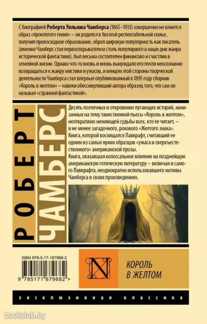 Десять поэтичных и откровенно пугающих историй, нанизанных на тему таинственной пьесы «Король в желтом», неотвратимо меняющей судьбы всех, кто ее читает, и не менее загадочного, рокового «Желтого знака». Книга, которой восхищался Лавкрафт, считавший ее одним из самых ярких образцов «ужаса и сверхъестественного» американской прозы. Книга, оказавшая колоссальное влияние на позднейшую американскую готическую литературу, — включая и самого Лавкрафта, неоднократно использовавшего мотивы Чамберса в своих произведениях.