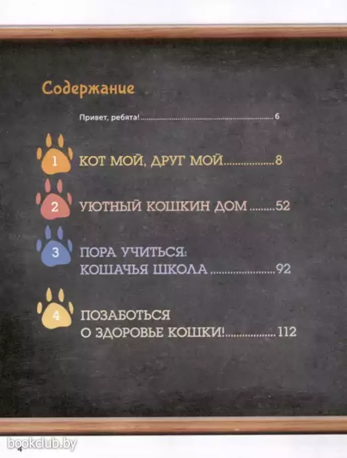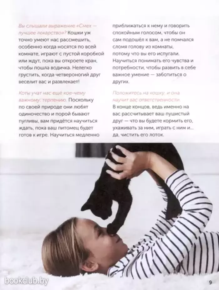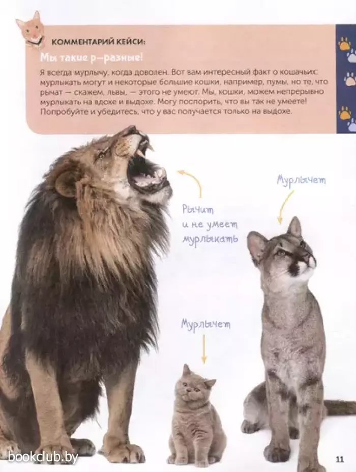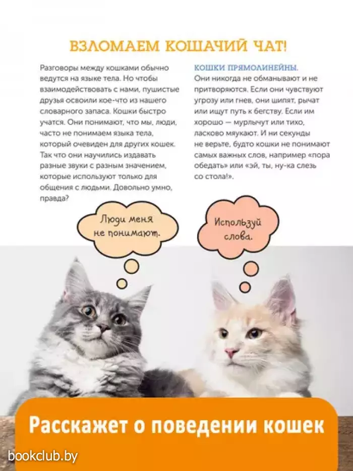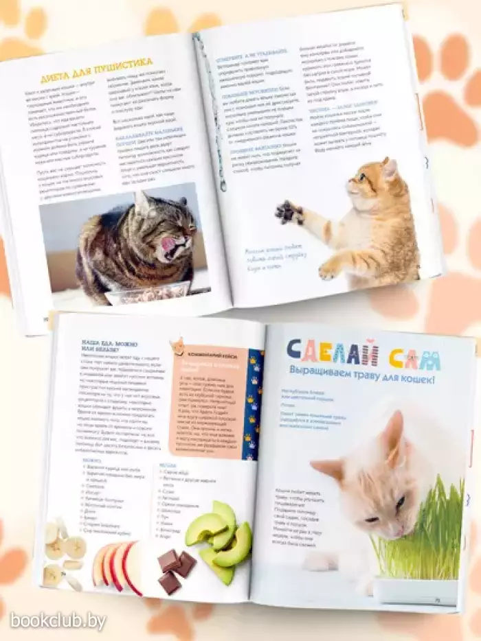 Книга дополнена красочными фотографиями и иллюстрациями, а также содержит подробные инструкции, которые помогут обучить кошку трюкам (например, давать лапу или прыгать через кольцо), а также создать собственными руками игрушки и лежанки для своего питомца.