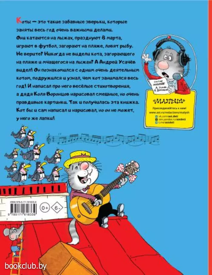 Коты — это такие забавные зверьки, которые заняты весь год очень важными делами. Они катаются на лыжах, празднуют 8 марта, играют в футбол, загорают на пляже, ловят рыбу. Не верите? Никогда не видели кота, загорающего на пляже и мчащегося на лыжах? А Андрей Усачёв видел! Он познакомился с одним очень деятельным котом, подружился и узнал, чем кот занимался весь год! И написал про него весёлые стихотворения, а дядя Коля Воронцов нарисовал смешные, но очень правдивые картинки. Так и получилась эта книжка. Кот бы и сам написал и нарисовал, но он не может, у него же лапки!