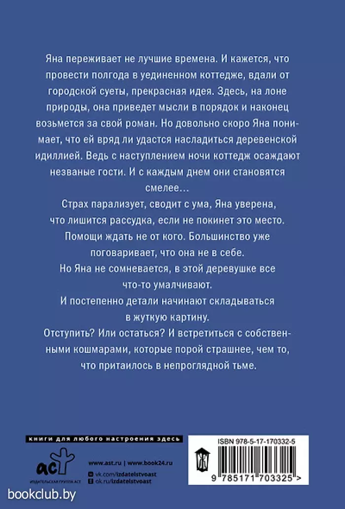 Яна переживает не лучшие времена. И поначалу ей кажется, что провести полгода в уединенном коттедже, вдали от городской суеты, прекрасная идея. Здесь, на лоне природы, она приведет мысли в порядок и наконец возьмется за свой роман. Но довольно скоро Яна понимает, что ей вряд ли удастся насладиться деревенской идиллией. Ведь с наступлением ночи коттедж осаждают незваные гости. И с каждым днем они становятся смелее… Страх парализует, сводит с ума, Яна уверена, что лишится рассудка, если не покинет этом место. Помощи ждать не от кого. Большинство уже поговаривает, что она не в себе. Но Яна не сомневается, что в этой деревушке все что-то умалчивают. И постепенно детали начинают складываться в жуткую картину. Отступить? Или остаться? И встретиться с собственными кошмарами, которые порой страшнее, чем то, что притаилось в непроглядной тьме.