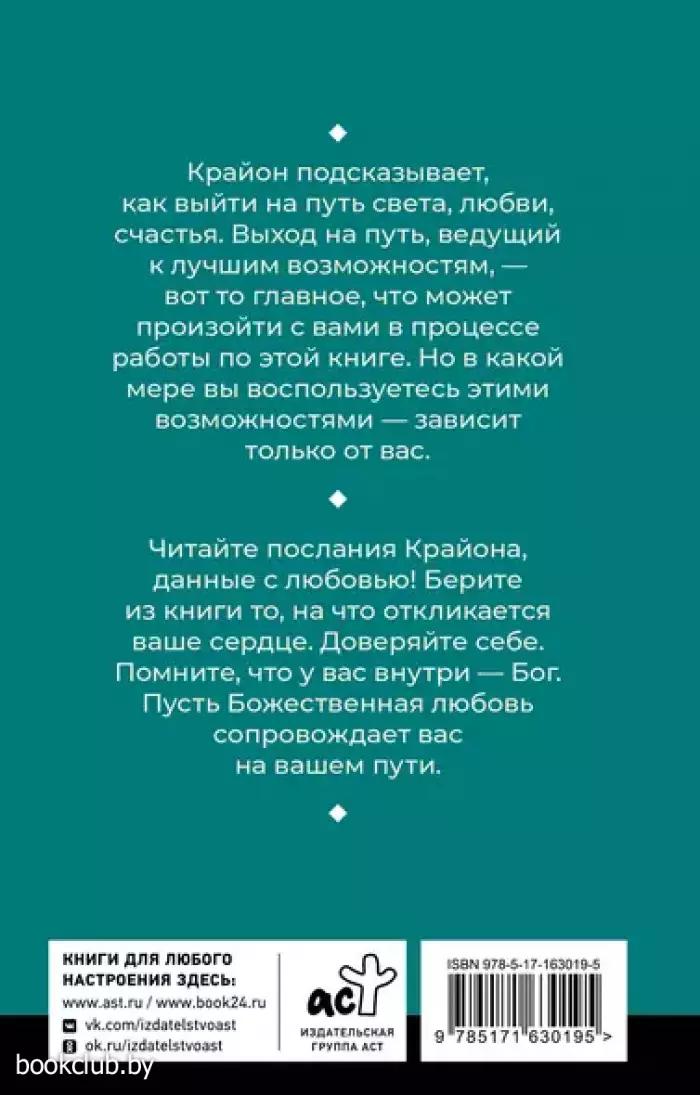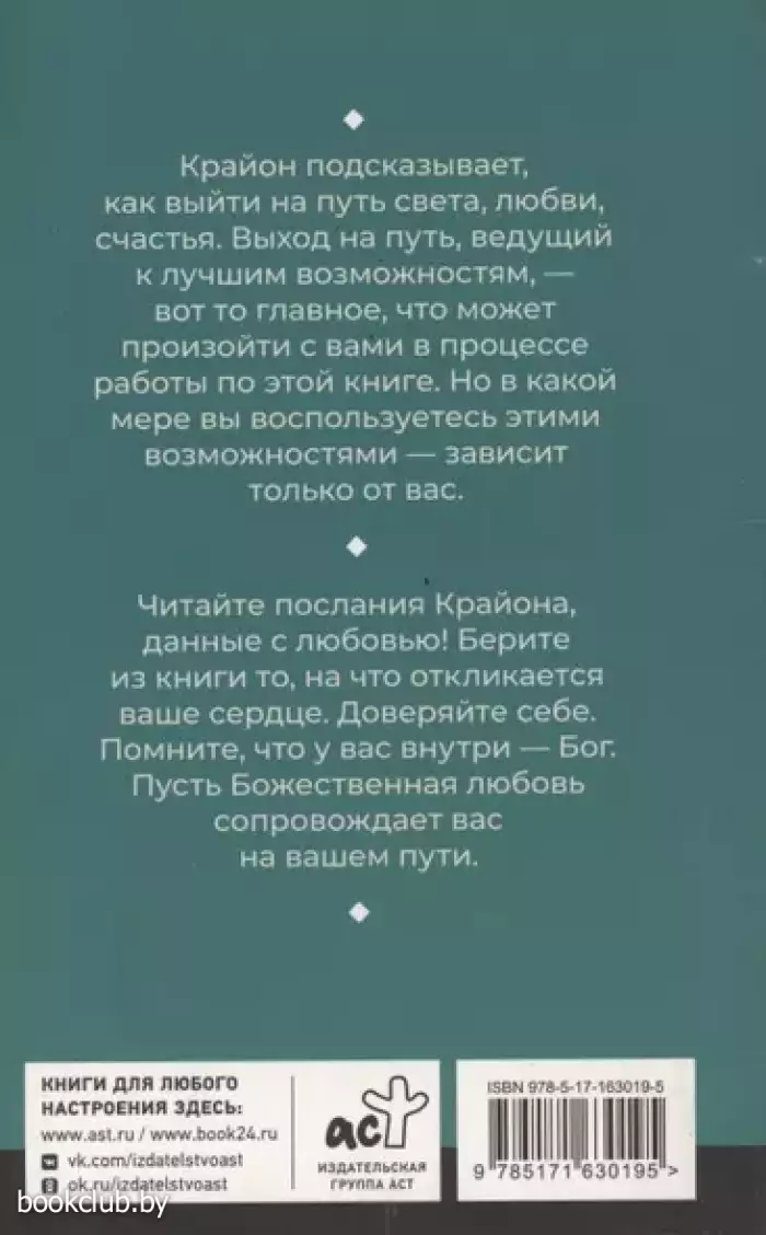Хроники Акаши — многомерное сознание Вселенной, в котором хранится информация о прошлом, настоящем и будущем всего человечества. В древние времена лишь избранные имели доступ к этому знанию, но теперь всё изменилось. Настала Новая Эра, и Крайон открывает эту возможность каждому из нас! Но как получить ключ к изменению своей судьбы? Как понять, в каком направлении двигаться, чтобы выполнить своё предназначение и стать счастливым? Вам помогут послания Крайона. Читайте и слушайте себя, следуйте тому, на что откликается ваше сердце, и помните: вы, и только вы направляете свою судьбу! Примите этот дар Крайона и получите знания, которые помогут вам достичь счастья и воплотить в жизнь ваши мечты. Станьте творцом вашей жизни! Эта книга поможет всем, кто хочет: · найти своё предназначение; · изменить свою жизнь к лучшему; · воплотить свои мечты в жизнь; · взять свою жизнь под контроль и стать счастливым. Книга в мягкой обложке. Формат покет.