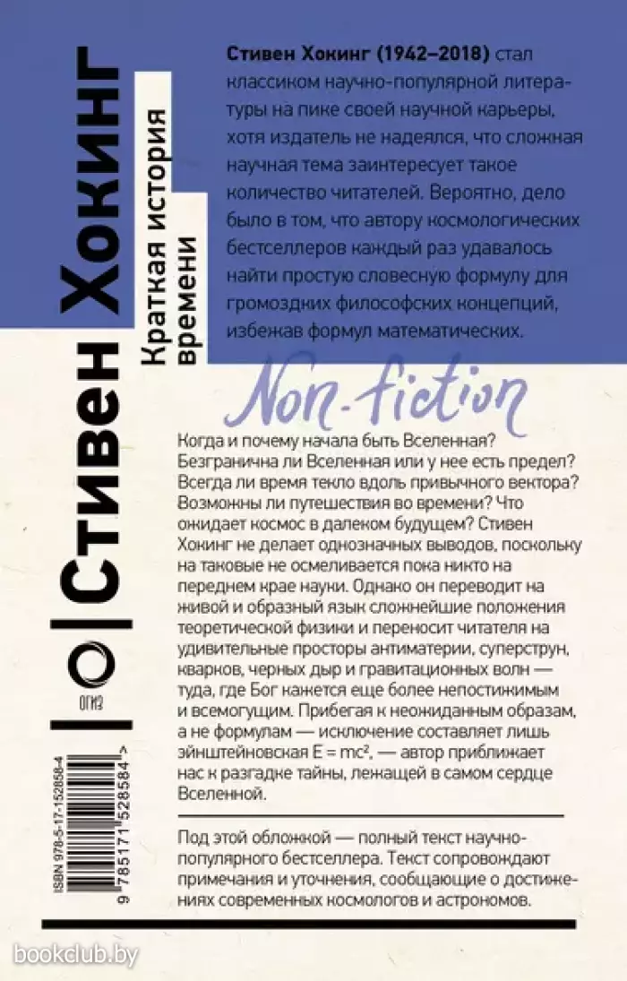 "Краткая история времени" Стивена Хокинга — один из столпов современной научно-популярной литературы. В этой книге автор пытается ответить на самые сложные и интригующие вопросы о мироздании: когда и почему началась Вселенная? безгранична ли Вселенная или у нее есть предел? всегда ли время текло вдоль привычного для нас вектора? возможны ли путешествия во времени? что ожидает космос в далеком будущем?Стивен Хокинг не делает однозначных выводов, поскольку на таковые не осмеливается пока никто на переднем крае науки. Однако он переводит на живой и образный язык сложнейшие положения теоретической физики и переносит читателя на удивительные просторы антиматерии, суперструн, кварков, черных дыр и гравитационных волн — туда, где Бог кажется еще более непостижимым и всемогущим. Прибегая к неожиданным образам, а не формулам — исключение составляет лишь эйнштейновская Е = mc2, — Стивен Хокинг приближает нас к разгадке тайны, лежащей в самом сердце Вселенной.Под этой обложкой — полный текст научно-популярного бестселлера. Текст сопровождают примечания и уточнения, сообщающие о достижениях современных космологов и астрономов.