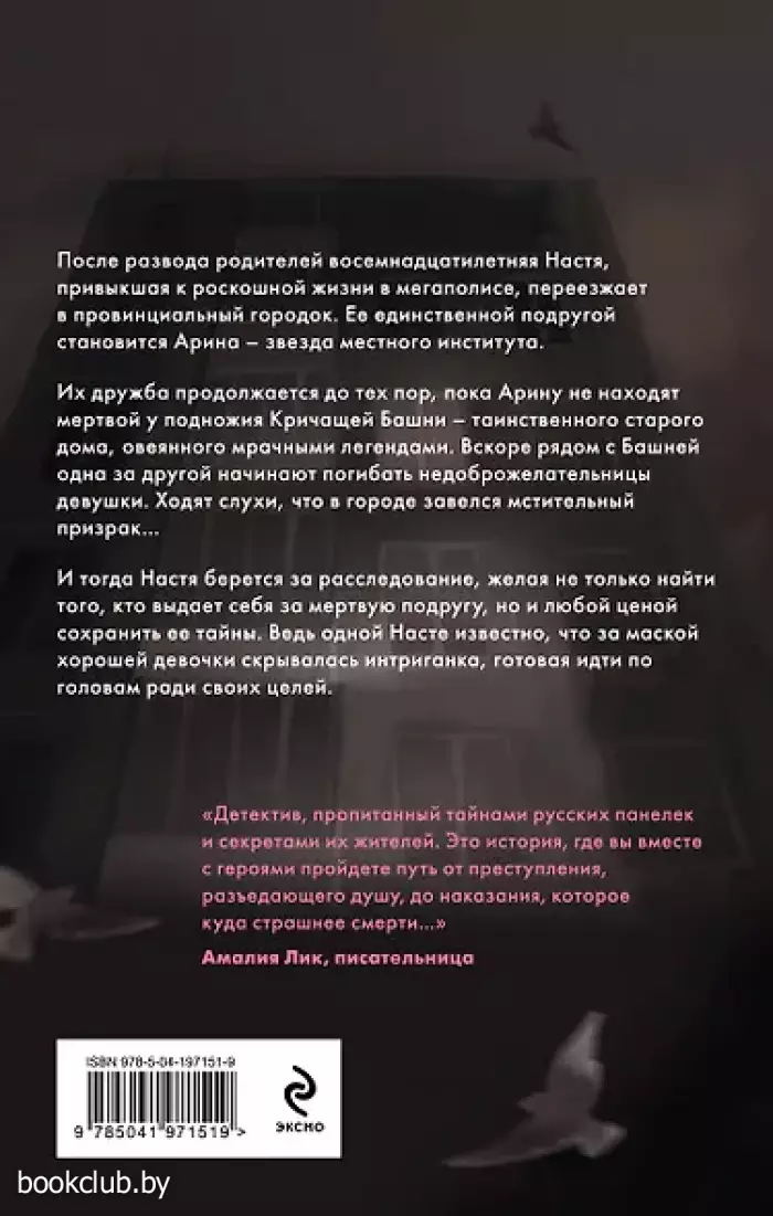 Детективный триллер в сеттинге мрачного русреала, наследующий традиции психологического романа Достоевского.История с городскими легендами русской глубинки в духе «Зайчика» Дмитрия Мордаса и культовой подростковой трилогии Мариам Петросян «Дом, в котором».После развода родителей восемнадцатилетняя Настя, привыкшая к роскошной жизни в мегаполисе, переезжает в провинциальный городок. Ее единственной подругой становится Арина –звезда местного института.Их дружба продолжается до тех пор, пока Арину не находят мертвой у подножья Кричащей Башни – таинственного старого дома, овеянного мрачными легендами. Вскоре рядом с Башней одна за другой начинают погибать недоброжелательницы девушки. Ходят слухи, что в городе завелся мстительный призрак…И тогда Настя берется за расследование, желая не только найти того, кто выдает себя за мертвую подругу, но и любой ценой сохранить ее тайны. Ведь только Насте известно, что за маской хорошей девочки скрывалась интриганка, готовая идти по головам ради своих целей.«Детектив, пропитанный тайнами русских панелек и секретами их жителей. Это история, где вы вместе с героями пройдете путь от преступления, разъедающего душу, до наказания, которое куда страшнее смерти…» Амалия Лик, писательница Книги издательства «ЭКСМО» из серии «Русреал-детектив» станут прекрасным дополнением вашей библиотеки. Для вашего удобства при оформлении заказа по телефону назовите код товара: 416966