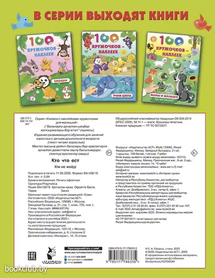 Ищете подарок сыну или дочке? «Кто что ест» — цветная книжка-развивайка, в которой 100 кружочков-наклеек, надолго увлечёт маленького непоседу. На каждой страничке сюжетные картинки, понятные ребёнку, — он с удовольствием сможет показать и назвать животных и их любимые лакомства. Простые потешки со звукоподражаниями легко запомнить и выучить наизусть. А занятия с мамой формируют социальные связи и навыки сотрудничества, создают доверительную атмосферу. Книга удобного формата — можно взять с собой в дорогу, на дачу, в путешествие. Бумага плотная и качественная. Крупные круглые наклейки с хорошей печатью, легко отделяются от основы — идеально подойдут для детских пальчиков. Подбирать наклейки для каждой картинки — весело, увлекательно и полезно. Сенсорная игра развивает мелкую моторику, внимание, усидчивость, координацию движений, пространственное мышление, фантазию и творческие способности. Интерактивная развивающая книжка-игра станет уникальным подарком для девочек и мальчиков на день рождения или Новый год.