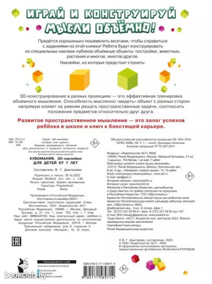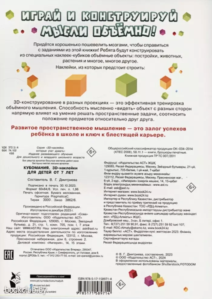 Книга «Кубомания. 3D-наклейки для детей от 7 лет» - правильный выбор и отличное приобретение. Для вашего удобства при оформлении заказа по телефону назовите код товара: 195743