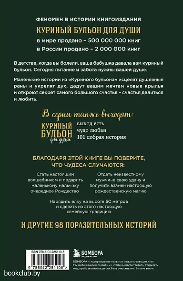 Книга от издательства «ЭКСМО», входящая в серию «Куриный бульон для души», принесет массу положительных впечатлений от прочтения и займет достойное место в вашей библиотеке. Для вашего удобства при оформлении заказа по телефону назовите код товара: 415758
