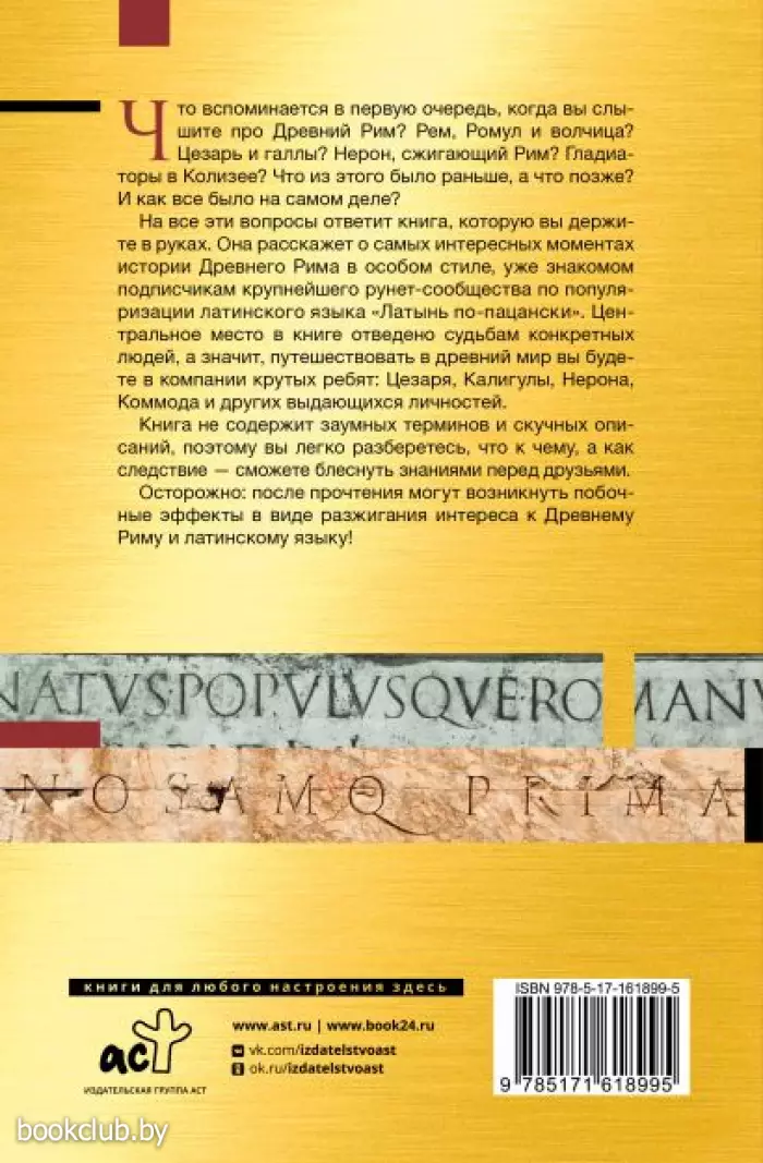 На все эти вопросы ответит книга, которую вы держите в руках. Она расскажет о самых интересных моментах истории Древнего Рима в особом стиле, уже знакомом подписчикам крупнейшего рунет-сообщества по популяризации латинского языка "Латынь по-пацански". Центральное место в книге отведено судьбам конкретных людей, а значит, путешествовать в древний мир вы будете в компании крутых ребят: Цезаря, Калигулы, Нерона, Коммода и других выдающихся личностей.