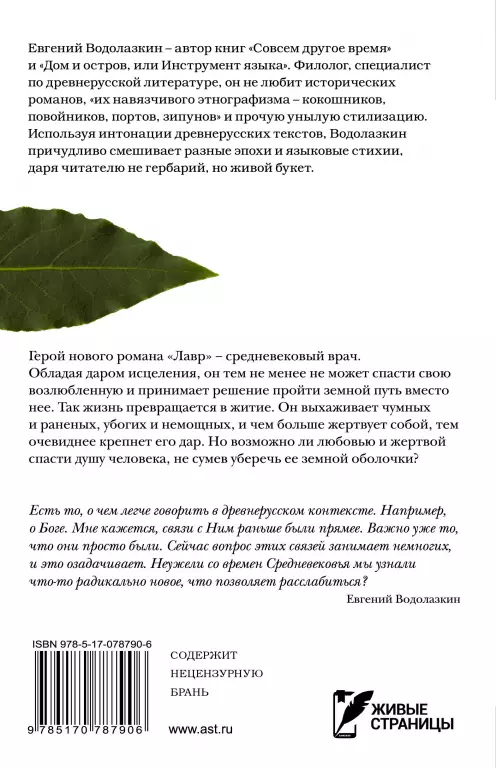 «Герой романа «Лавр» — средневековый врач. Обладая даром исцеления, он тем не менее не может спасти свою возлюбленную и принимает решение пройти земной путь вместо нее. Так жизнь превращается в житие. Он выхаживает чумных и раненых, убогих и немощных, и чем больше жертвует собой, тем очевиднее крепнет его дар. Но возможно ли любовью и жертвой спасти душу человека, не сумев уберечь ее земной оболочки? Есть то, о чем легче говорить в древнерусском контексте. Например, о Боге. Мне кажется, связи с Ним раньше были прямее. Важно уже то, что они просто были. Сейчас вопрос этих связей занимает немногих, что озадачивает. Неужели со времен Средневековья мы узнали что-то радикально новое, что позволяет расслабиться? »