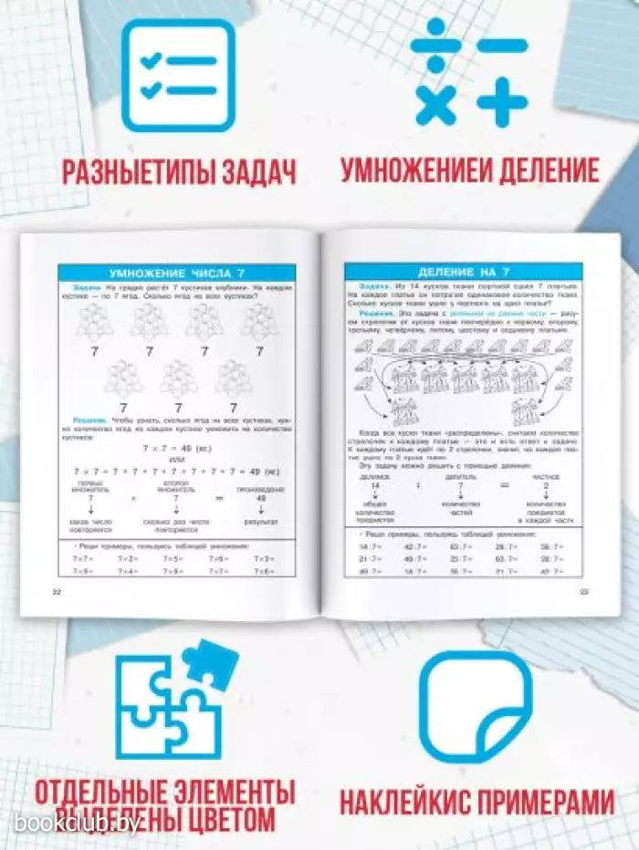 «Легко учим таблицу умножения» — это пособие для учеников 1−4 классов. Занятия по книге — простой и эффективный способ освоить таблицу умножения. Школьники выучат законы умножения и деления, научатся решать разные типы задач и закрепят полученные знания с помощью примеров. Отдельные элементы текста в пособии выделены цветом — это упрощает запоминание информации. Также в книге даны цветные наклейки-шпаргалки. Стикеры с примерами из таблицы умножения можно наклеить на обложку учебника или тетради — таким образом, подсказка всегда будет перед глазами.