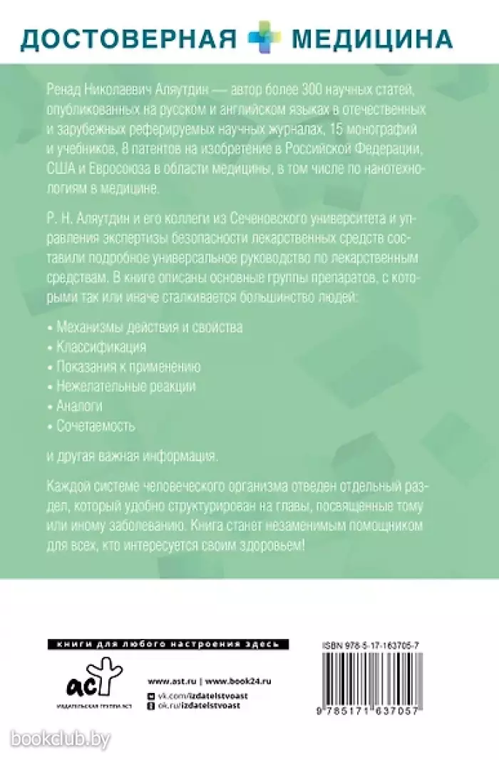 Р. Н. Аляутдин и его коллеги из Сеченовского университета и управления экспертизы безопасности лекарственных средств составили подробное универсальное руководство по лекарственным средствам. В книге описаны основные группы препаратов, с которыми так или иначе сталкивается большинство людей: