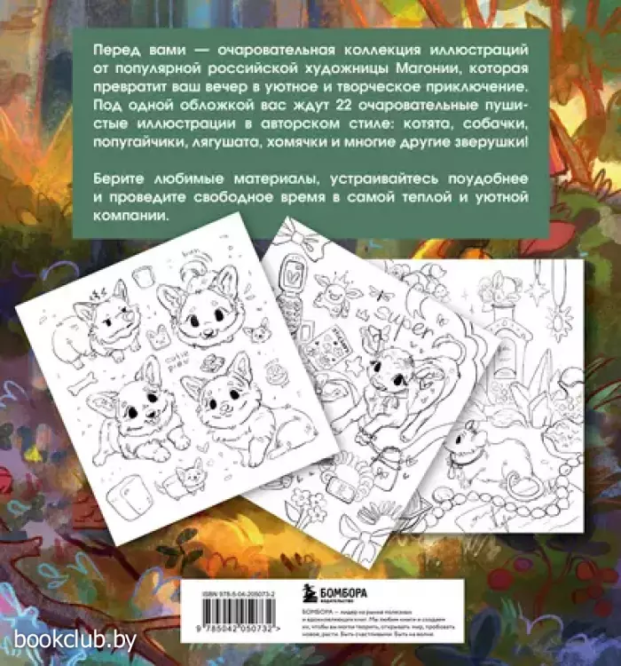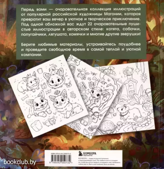 Перед вами — очаровательная коллекция иллюстраций от популярной российской художницы Магонии, которая превратит ваш вечер в уютное и творческое приключение. Под одной обложкой вас ждут 22 очаровательные пушистые иллюстрации в авторском стиле: котята, собачки, попугайчики, лягушата, хомячки и многие другие зверушки! Берите любимые материалы, устраивайтесь поудобнее и проведите свободное время в самой теплой и уютной компании.