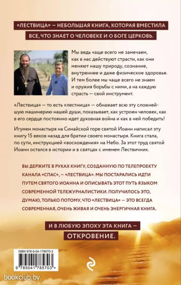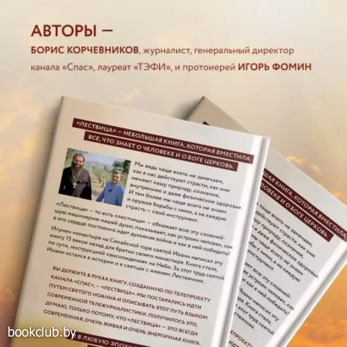 «Лествица святого Иоанна Лествичника. Тридцать ступеней на пути к Богу» - книга, созданная по телепроекту канала «Спас». Борис Корчевников и протоиерей Игорь Фомин постарались идти путем святого Иоанна и описывать этот путь языком современной тележурналистики. «Лествица» - это всегда современная, очень живая и очень энергичная книга. И в любую эпоху это книга-откровение.