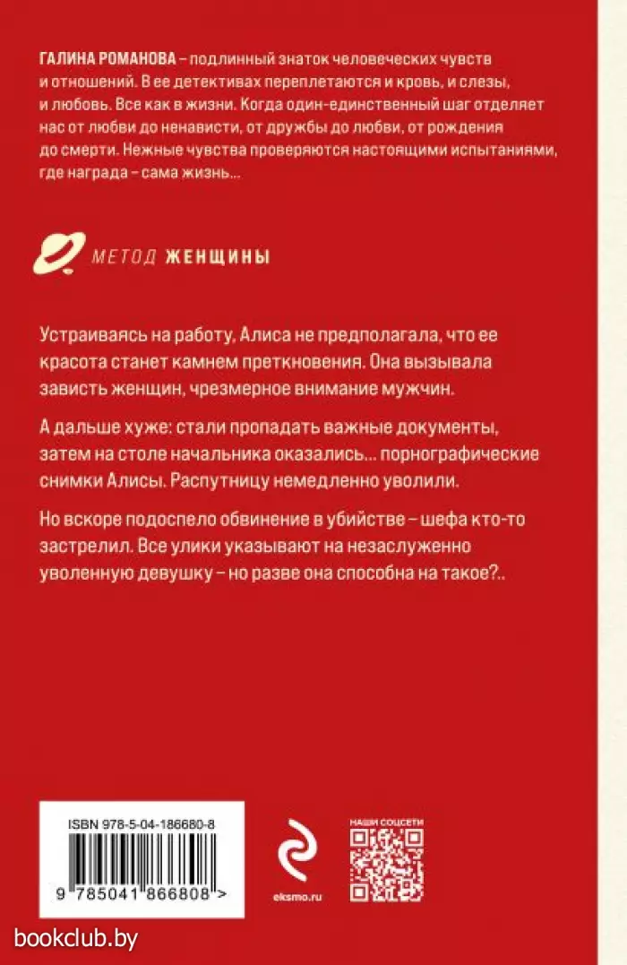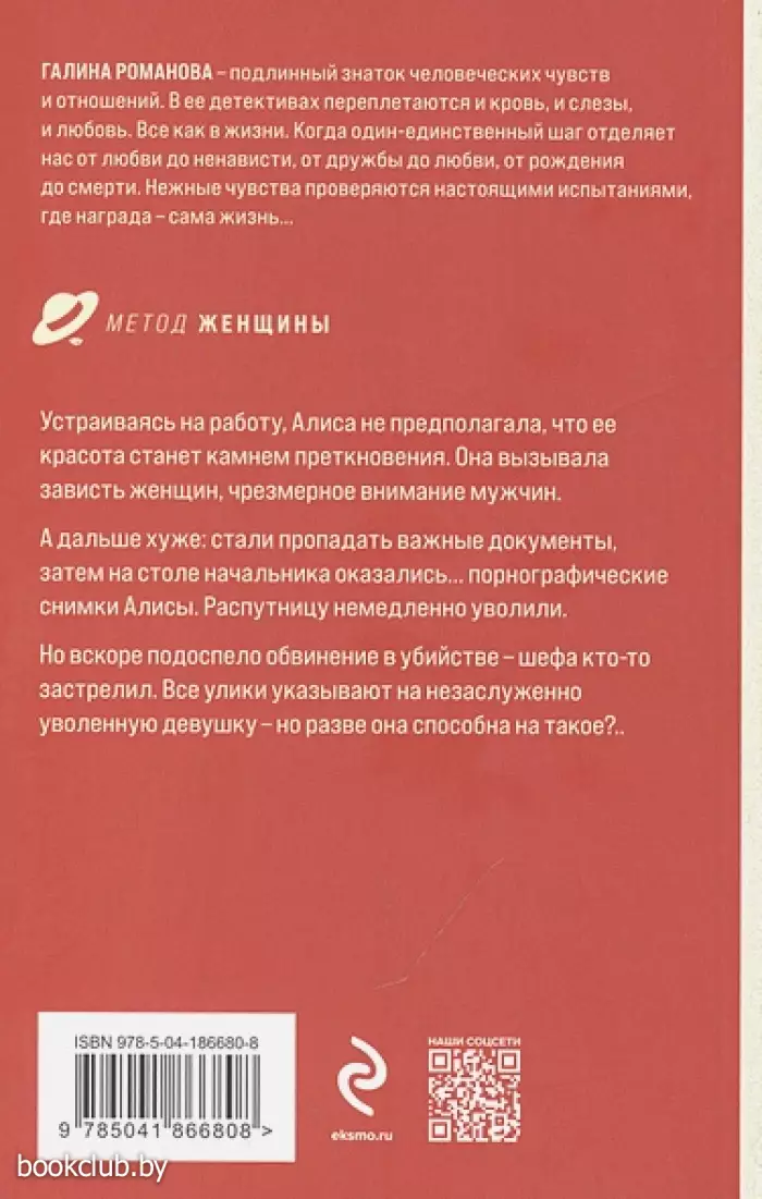 Книги издательства «ЭКСМО» из серии «Детективы Галины Романовой. Метод Женщины. Новое оформление» - правильный выбор и отличное приобретение. Для вашего удобства при оформлении заказа по телефону назовите код товара: 190701