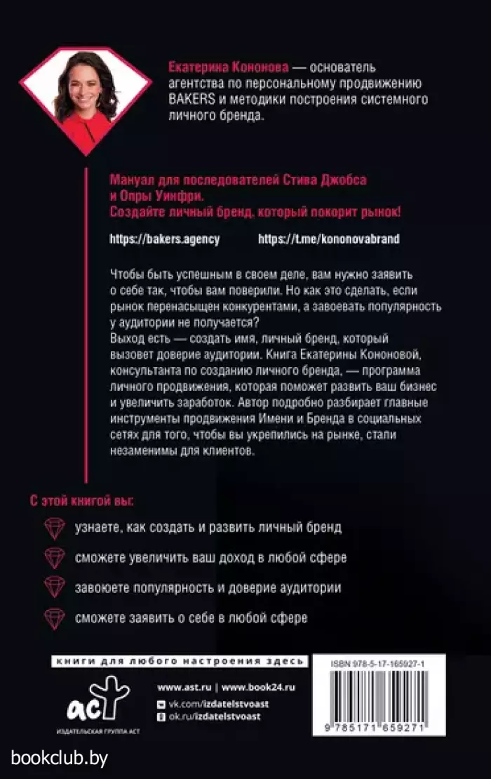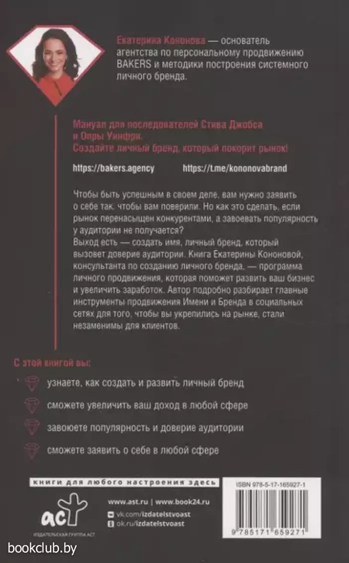 Чтобы быть успешным в своем деле, вам нужно заявить о себе так, чтобы вам поверили. Но как это сделать, если рынок перенасыщен конкурентами, а завоевать популярность у аудитории не получается? Выход есть — создать имя, личный бренд, который вызовет доверие аудитории. Книга Екатерины Кононовой, консультанта по созданию личного бренда, — программа личного продвижения, которая поможет развить ваш бизнес и увеличить заработок. Автор подробно разбирает главные инструменты продвижения Имени и Бренда в социальных сетях для того, чтобы вы укрепились на рынке, стали незаменимы для клиентов. Вы научитесь составлять медиаплан, контент-план, пресс-портрет и многое другое! Книга поможет в создании личного бренда практически в любом направлении: от моды до юридической практики и медицины. С помощью этой книги вы: • узнаете, как создать и развить личный бренд; • сможете увеличить ваш доход в любой сфере; • завоюете популярность и доверие аудитории; • сможете заявить о себе в любой сфере. Позвольте вашему имени работать на вас! Книга в твердой обложке.